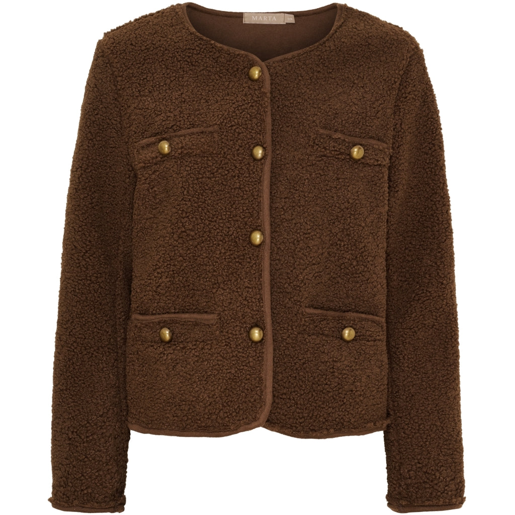 Lækker indendørsjakke fra Marta du Château i blødt teddy look. Jakken lukkes med messingfarvede knapper og fine detaljer foran. Perfekt over en kjole eller skjorte hertil efteråret.