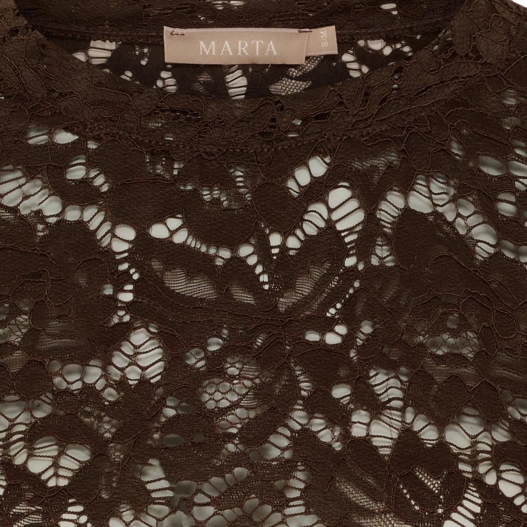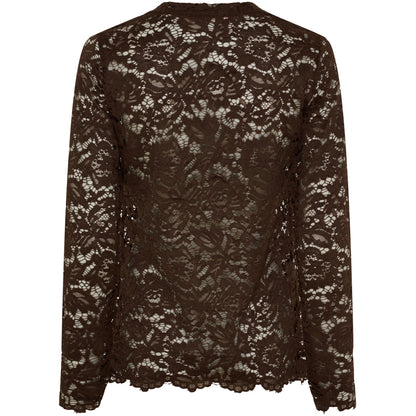 Super fin blondebluse fra Marta du Château i en lækker, mørkebrun farve. De fine blondebluser er gode under din blazer eller en vest. Leg med kontrasterne og style med en strik kappe.