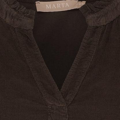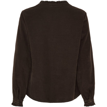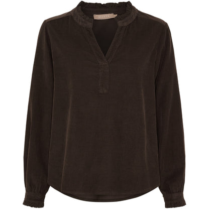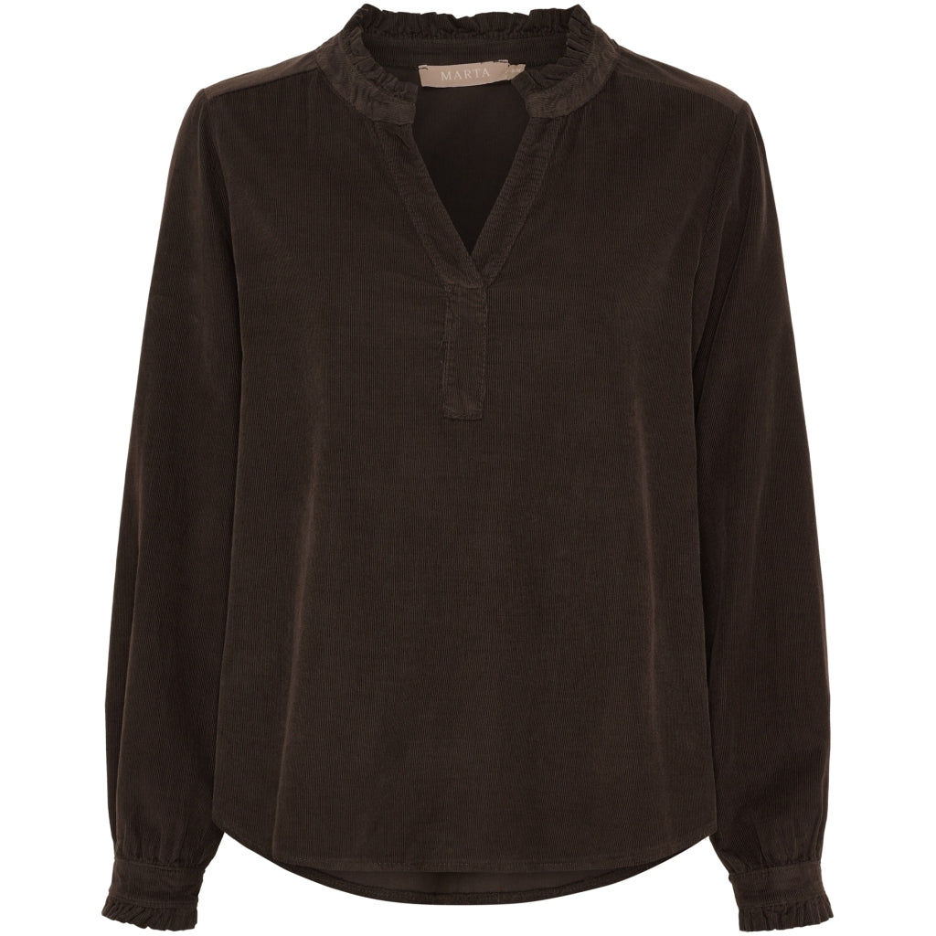 Lækker, mørkebrun fløjlsbluse fra Marta du Château. Blusen har klassisk v-udskæring og fin kinakrave.
