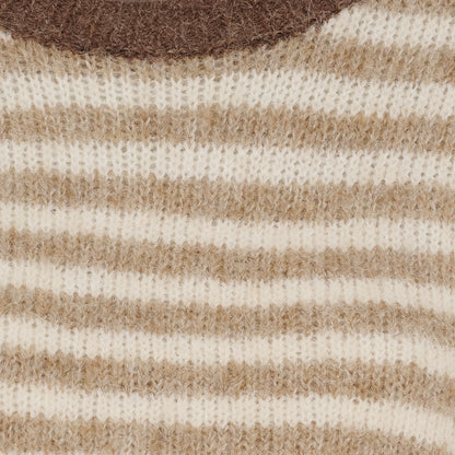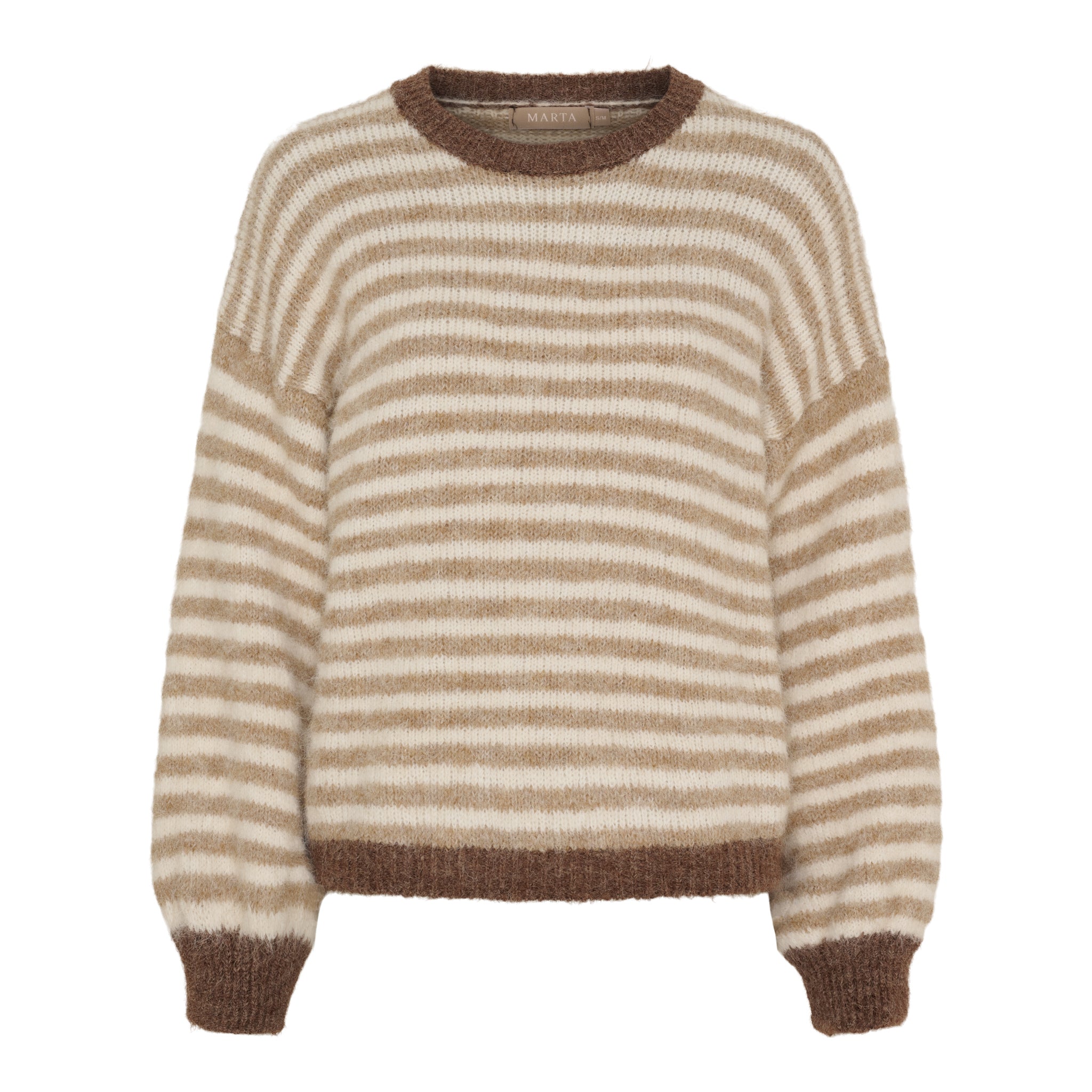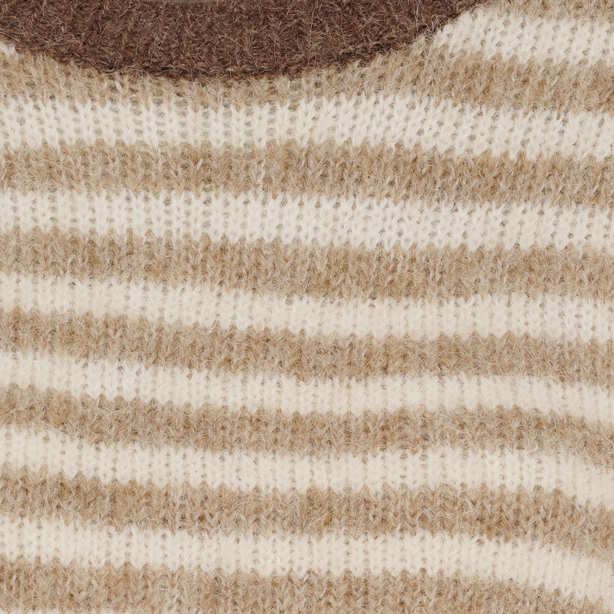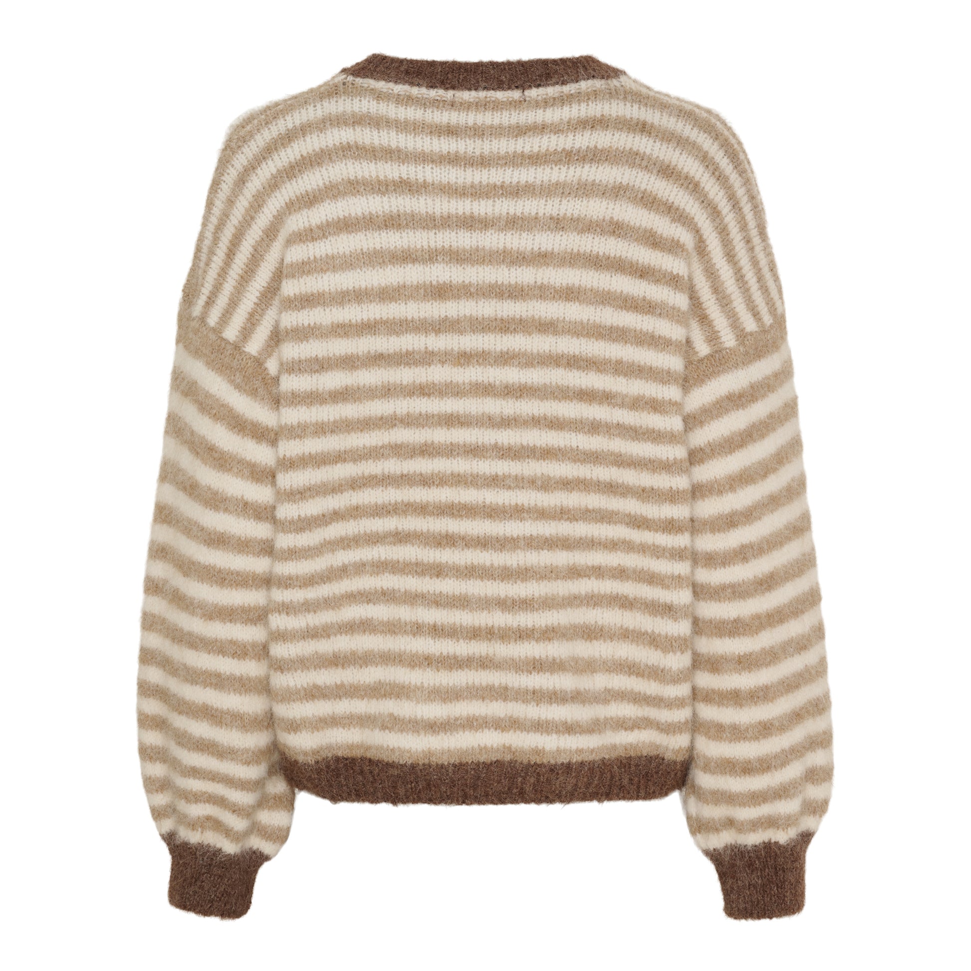 Lækker stribet strikbluse i nougat og off white. Strikblusen er afsluttet med brune ribkanter, som giver en virkelig fin kontrast til de lysebrune striber. Style til brune eller lysebrune bukser og leg med de varme farver i dit outfit.