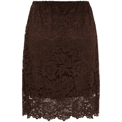 Kort blondenederdel fra Marta du Château i mørkebrun. Nederelen stopper ved knæene og har elastik i linningen for ekstra komfort. Style med en sweatshirt, hvis det skal være lidt mere råt.