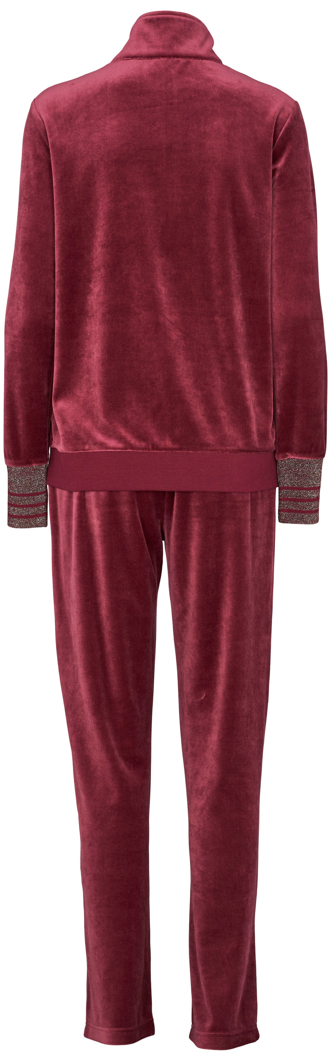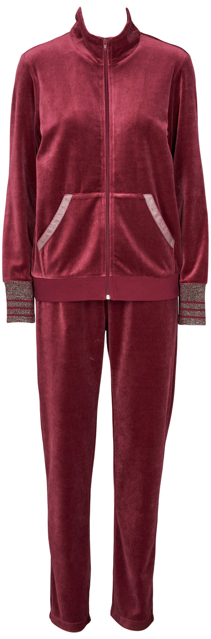 Det klassiske veloursæt fra Missya er kommet i en flot bordeaux farve her til efteråret. Alice sættet består af et bukser med elastik i linningen, samt en bluse der lukkes med lynlås og har kænguru lommer foran. De brede manchetter på velourblusen giver en flot afslutning. Det perfekte sæt til hyggestunderne derhjemme, hvor det bare skal være behageligt og afslappet.