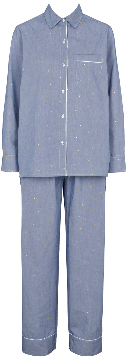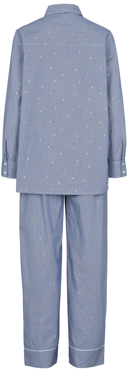 Sød bomulds pyjamas fra Missya med mælkedrenge strib og fine sølvstjerner. Pyjamassen er flot afsluttet med hvide satinkanter, som giver et mere eksklusivt look. style med en hvid t-shirt, som du ser på modelbilledet. Perfekt til hyggedagene derhjemme.