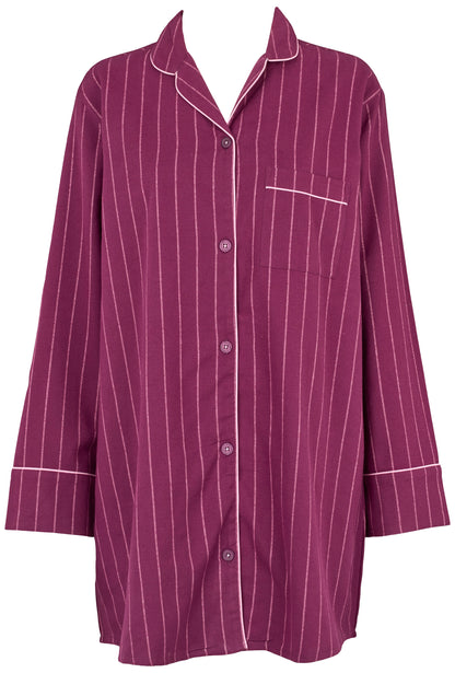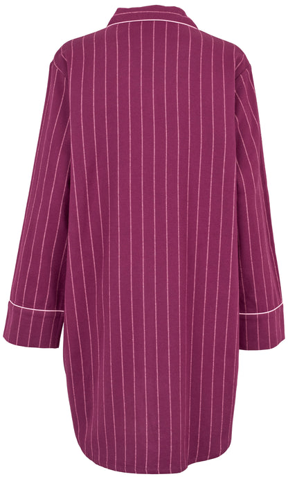 Lang natskjorte fra Missya i bordeaux flonel. De smalle striber og fine satinkanter afslutter pyjamasskjorten på fin vis. Den lange skjorte har runding bagpå og går ned over bagdelen. Natskjorten er lavet i opkradset bomuld, så du får den bløde flonel fornemmelse, der er så lækker, når det kommer til nattøj.