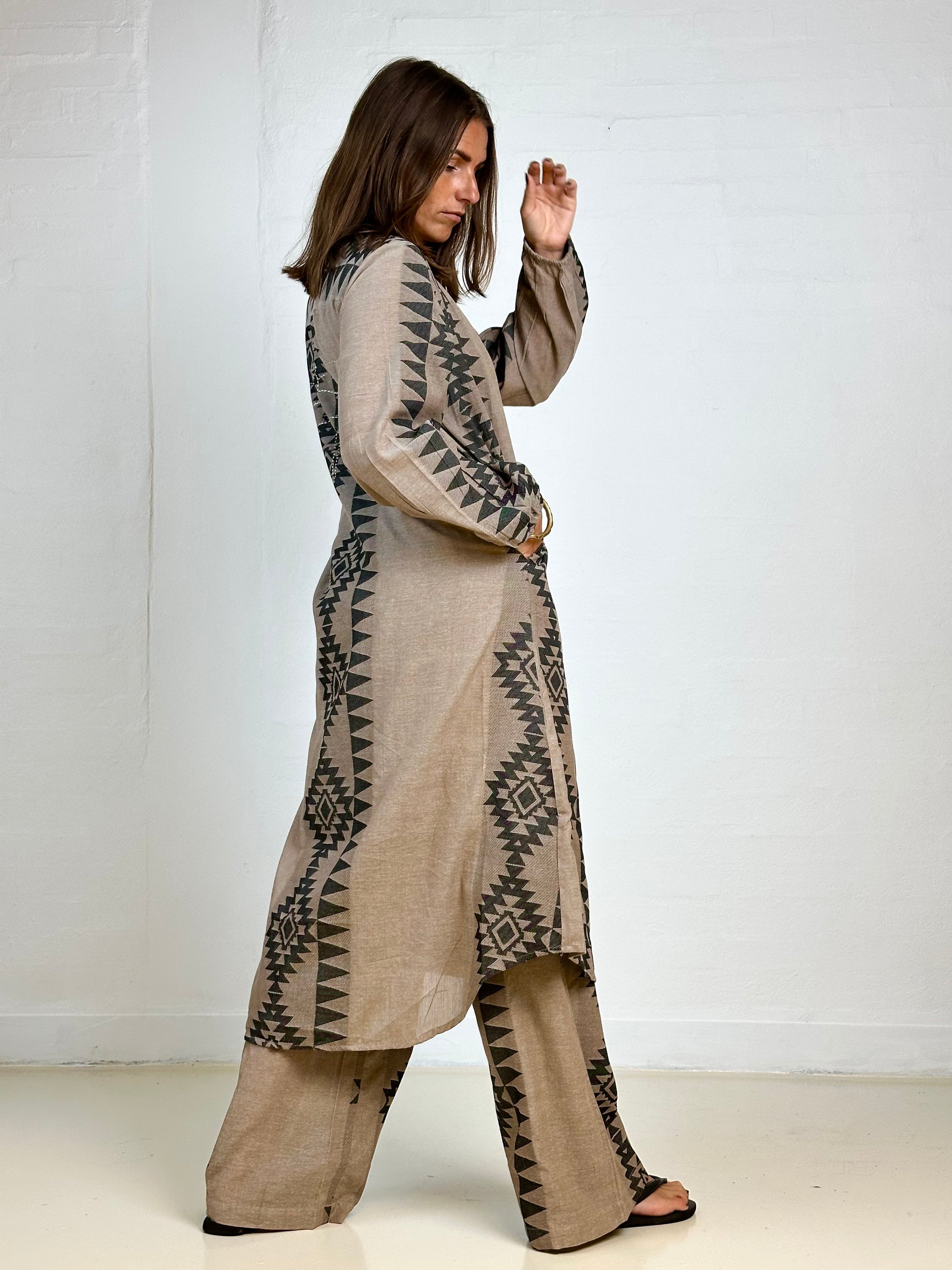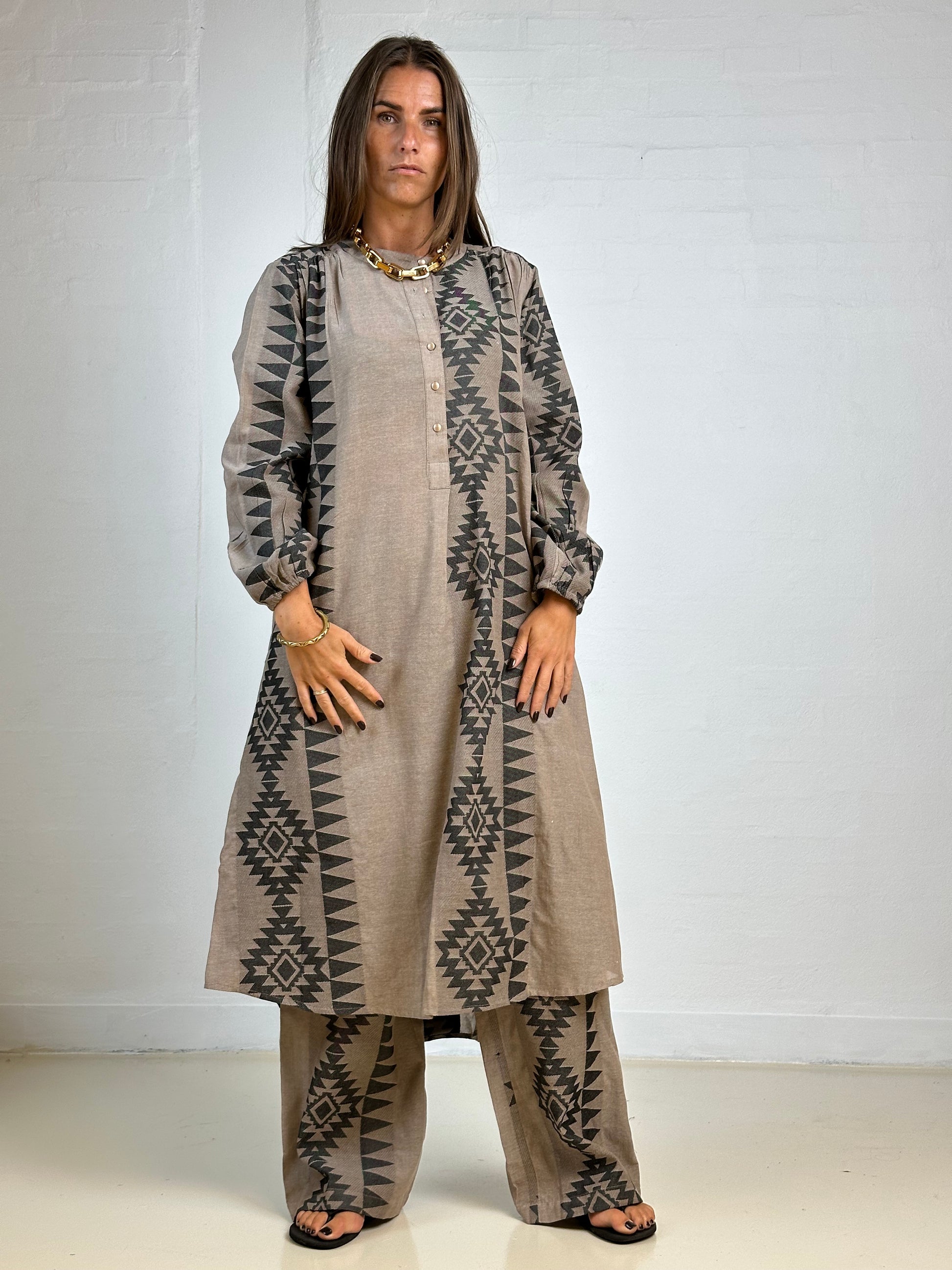 Lækker efterårskjole fra Gaspar i græsk design. Kjolen er lang med et lige snit, der er længere bagpå end foran. Super flot med en høj støvle til.