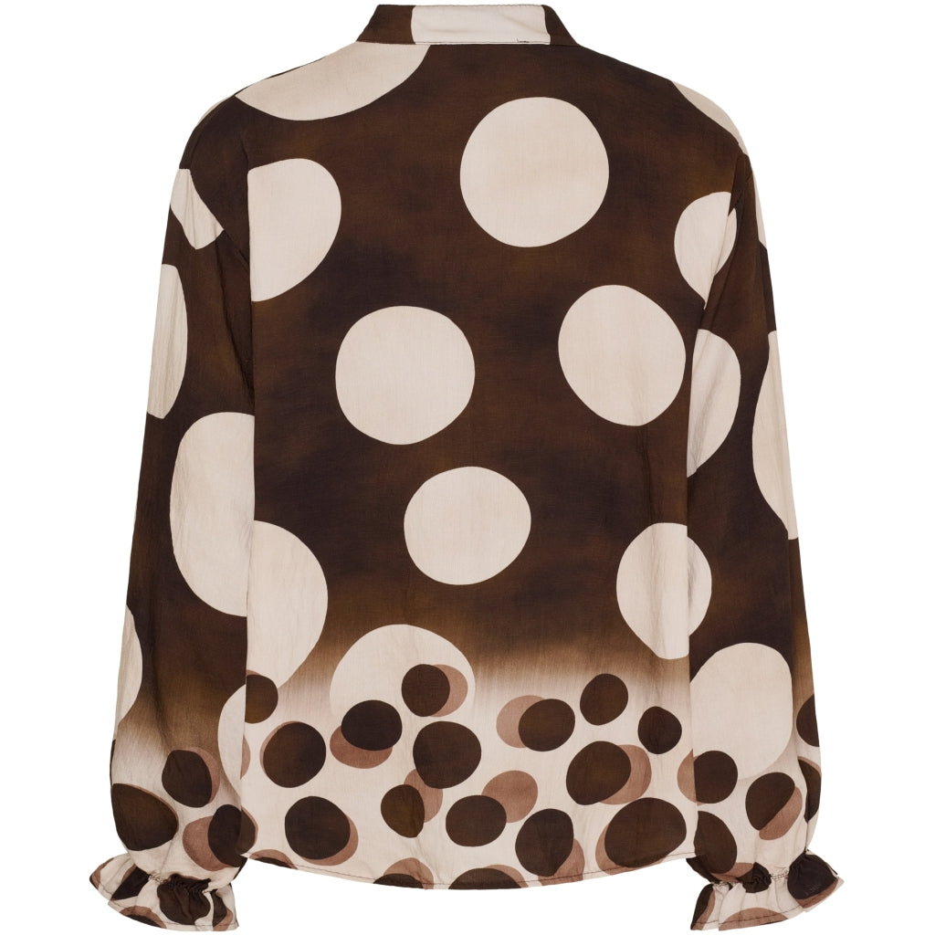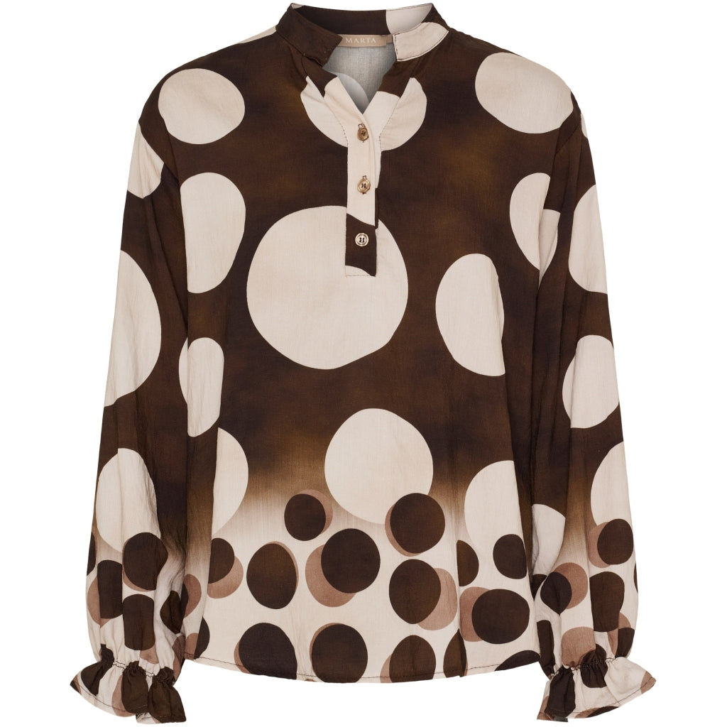 Lækker bluse fra Marta du Château i en flot, mørkebrun farve. De lyse bomber i forskellige størrelser, giver blusen en fin efterårsvibe. Ærmerne er afsluttet med flæse, så det hele lige bliver lidt mere feminint. Style med lyse eller brune bukser.