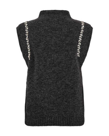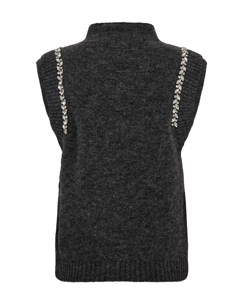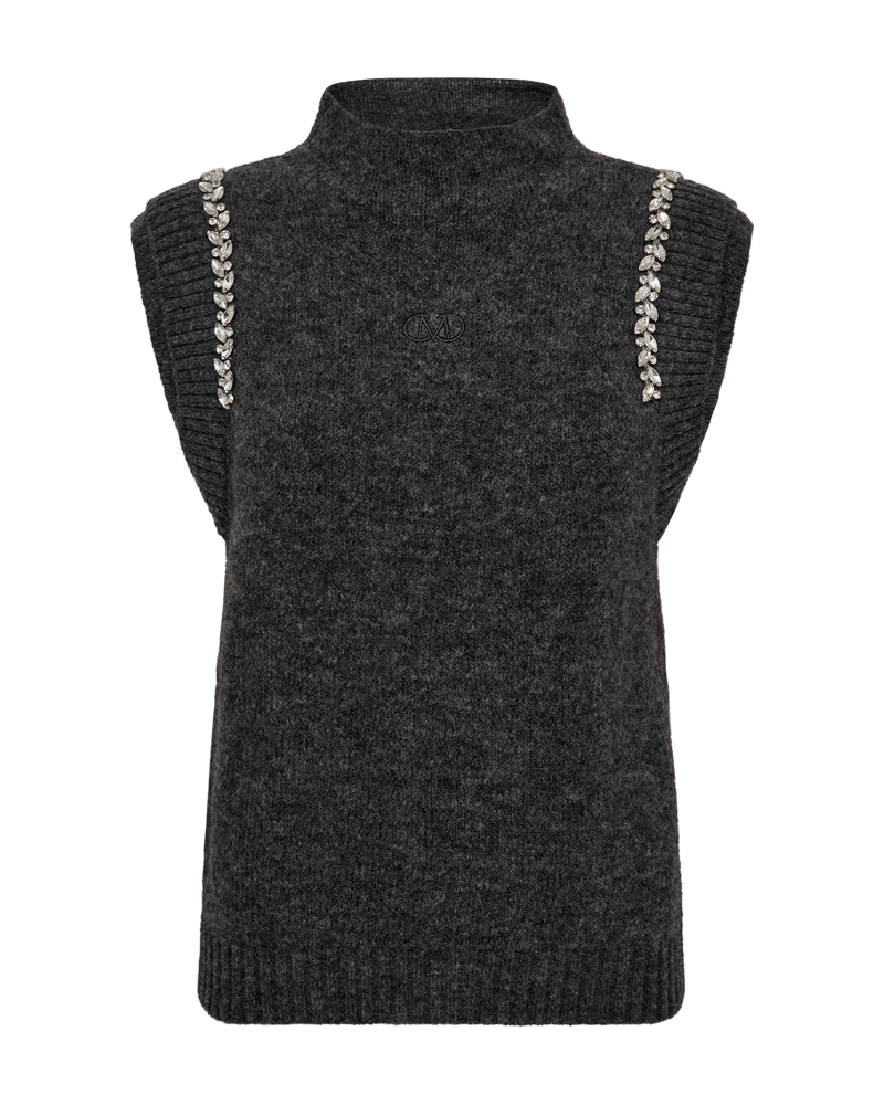 Feminin strikvest i mørkegrå uldblanding. Vesten har en lille stående krave og de fineste similisten, der følger ærmeudskæringen foran og bagpå. Det lille ærme sikrer, at snittet bliver mere firkantet og at dine arme syner længere. Style vesten som den er til dine sorte bukser, eller sæt en hvid skjorte eller en mesh bluse under, hvis du ikke er til de bare arme.
