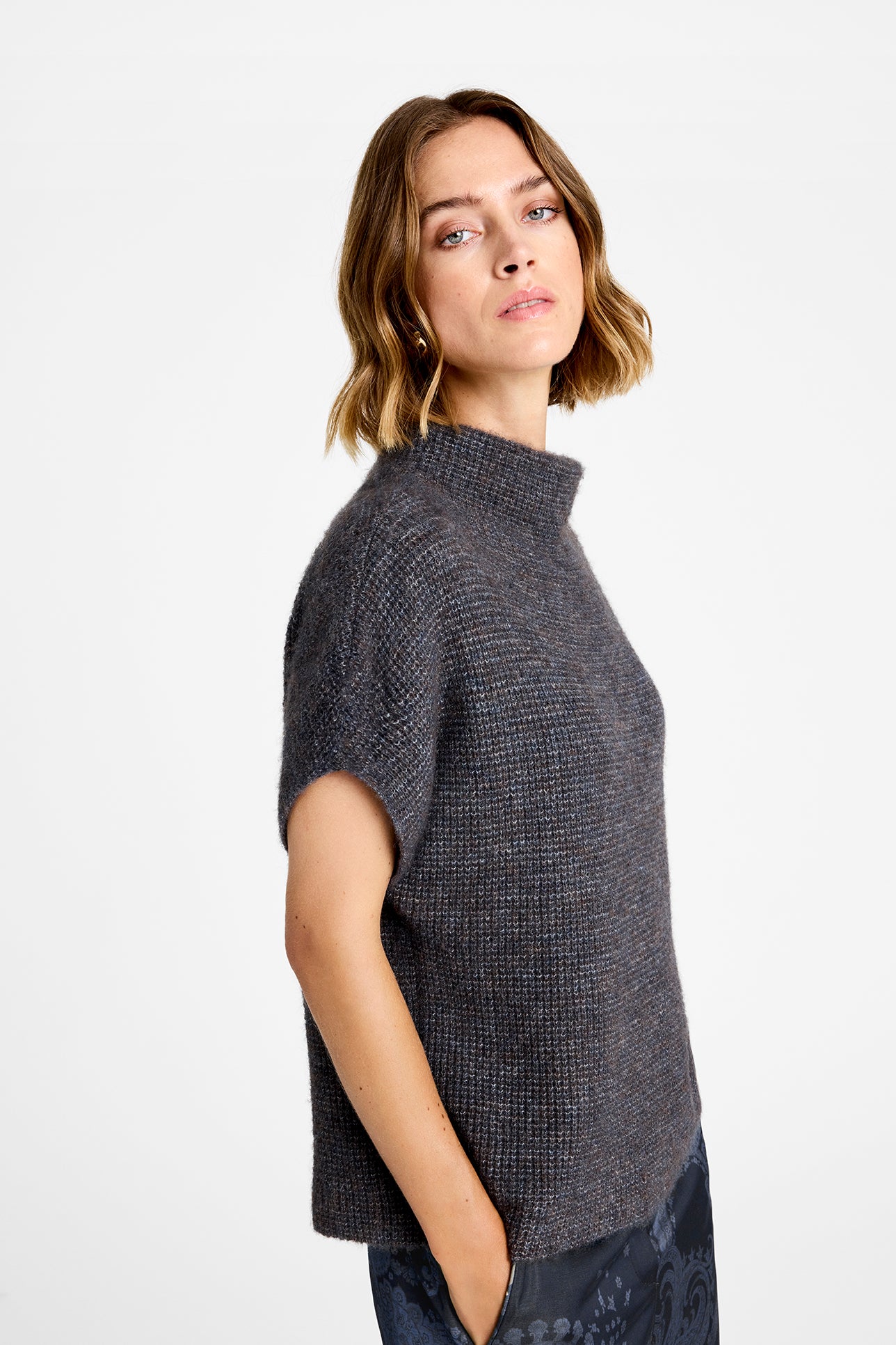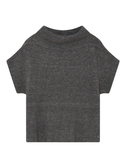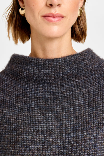 Den flotte Coya kappe fra Gustav er kommet i et skønt efterårslook. De brune og blå toner giver strikken et både varmt og råt udtryk. Kappen har stående krave og store ærmer. Den er flot at style med en blondebluse eller skjorte under.