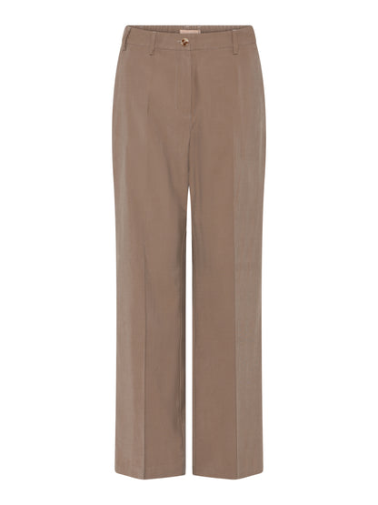 Lækre lysebrune bukser fra Gustav med brede ben. Buksen er lavet i en god viskose kvalitet og falder flot. Style med en off white strik eller skjorte og fremhæv de lyse toner. Esta buksen lukkes med skjult lynlås og knap øverst.