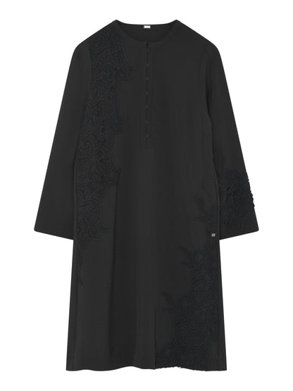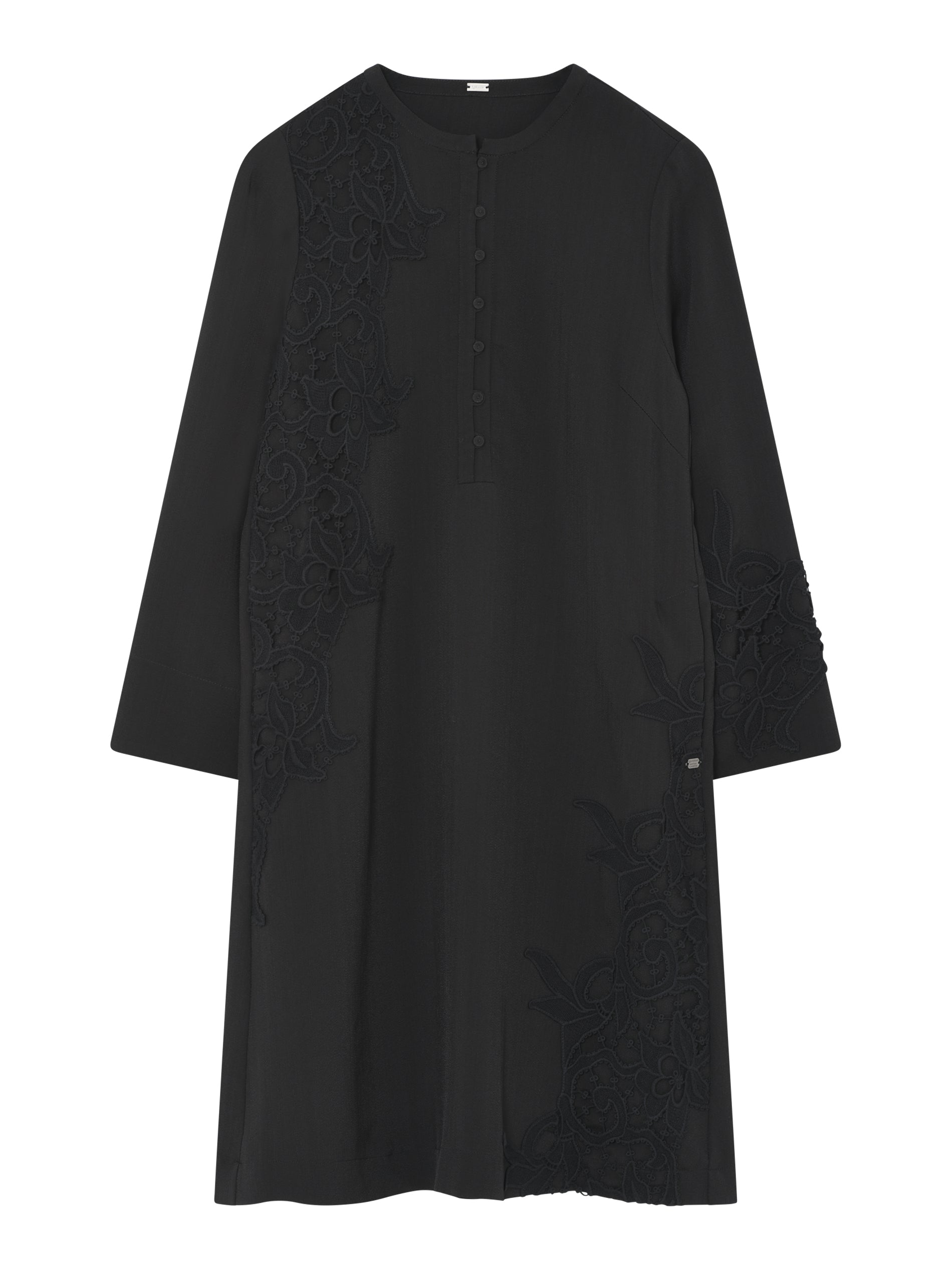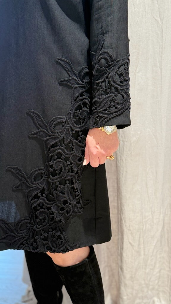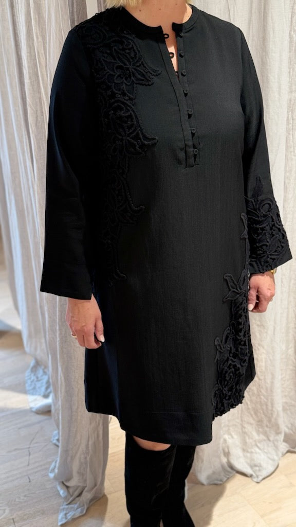 Enkel og stilet sort kjole fra Gustav. De fine broderie anglaise detaljer på både ærmer og kjole bryder det sorte, så der lige sker lidt mere. Længden er god og stopper ca. ved knæene. Den kan derfor bruges over et par smalle skindbukser, men også sagtens med dine yndlingsstøvler og en fin strømpe.