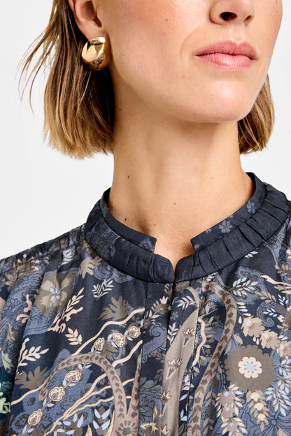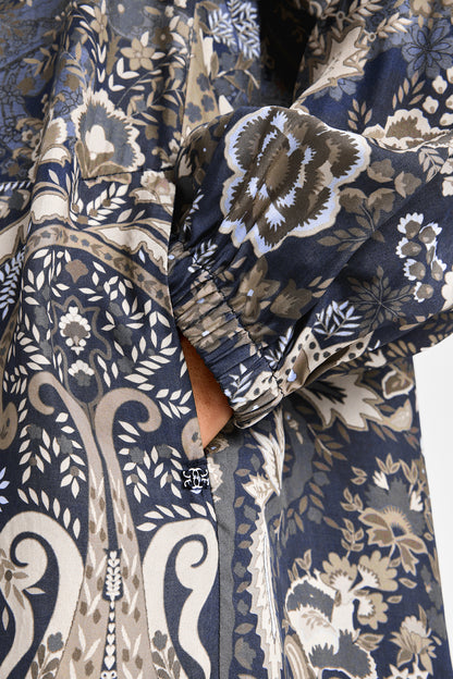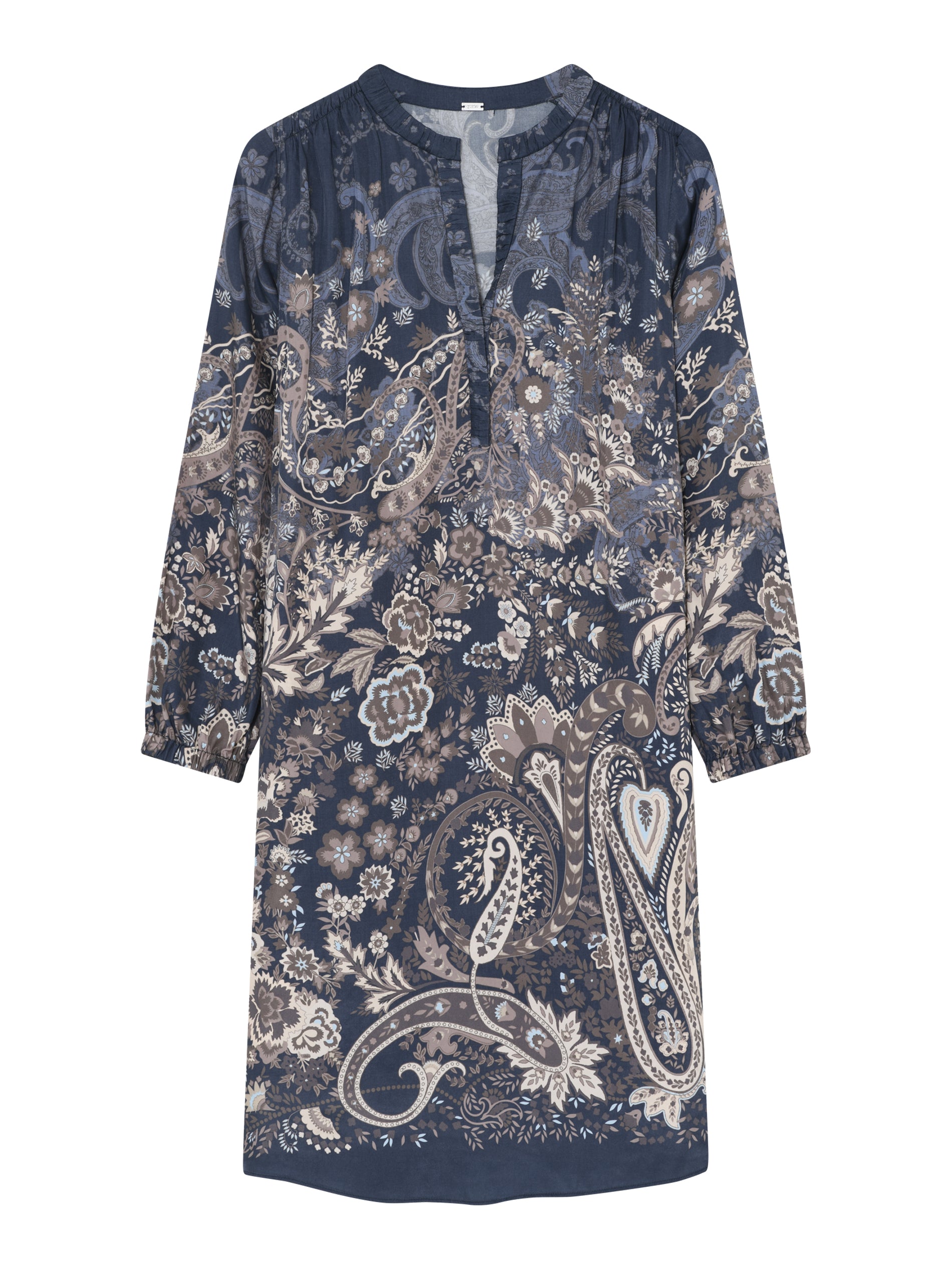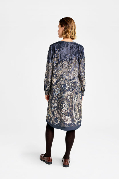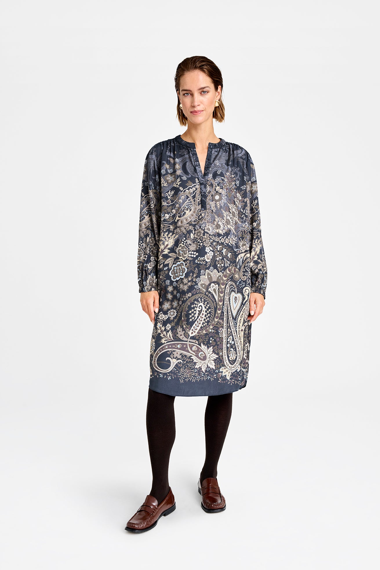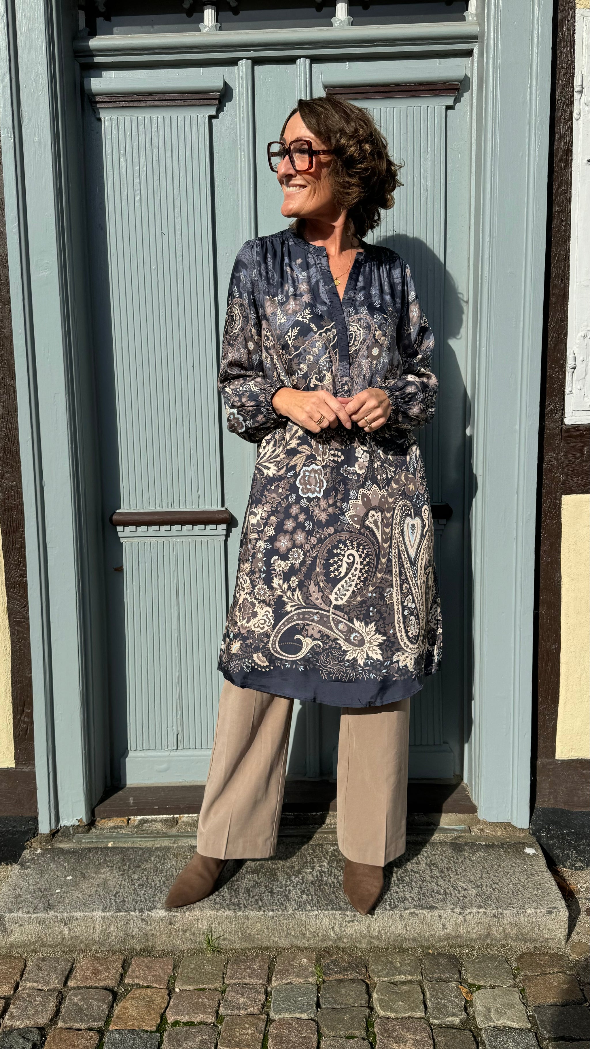 Knælang kjole fra Gustav i et flot blå gråt print. Sikka kjolen går lige op og ned i et enkelt snit. Ærmerne er afsluttet med en flot elastikkant og så har du skrålommer i siderne, så du føler dig godt tilpas. Den printede kjole er flot med loafers som på billedet, men du kan også fint sætte et par høje støvler til.