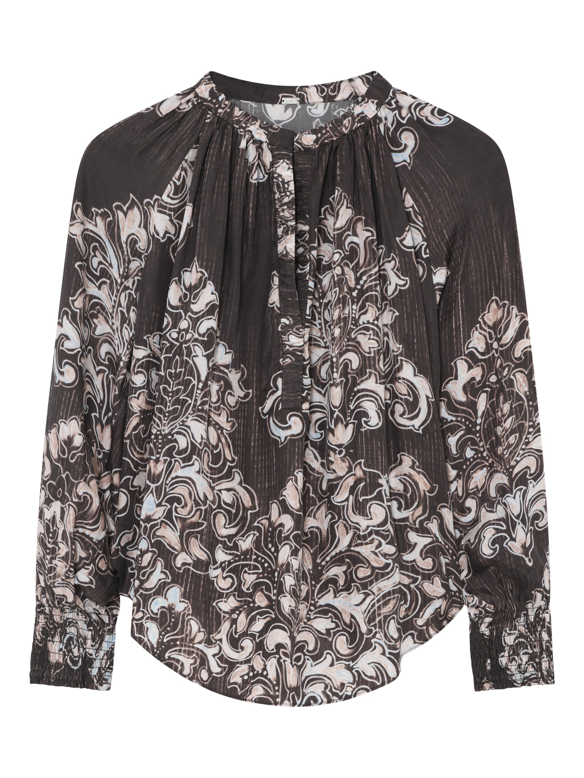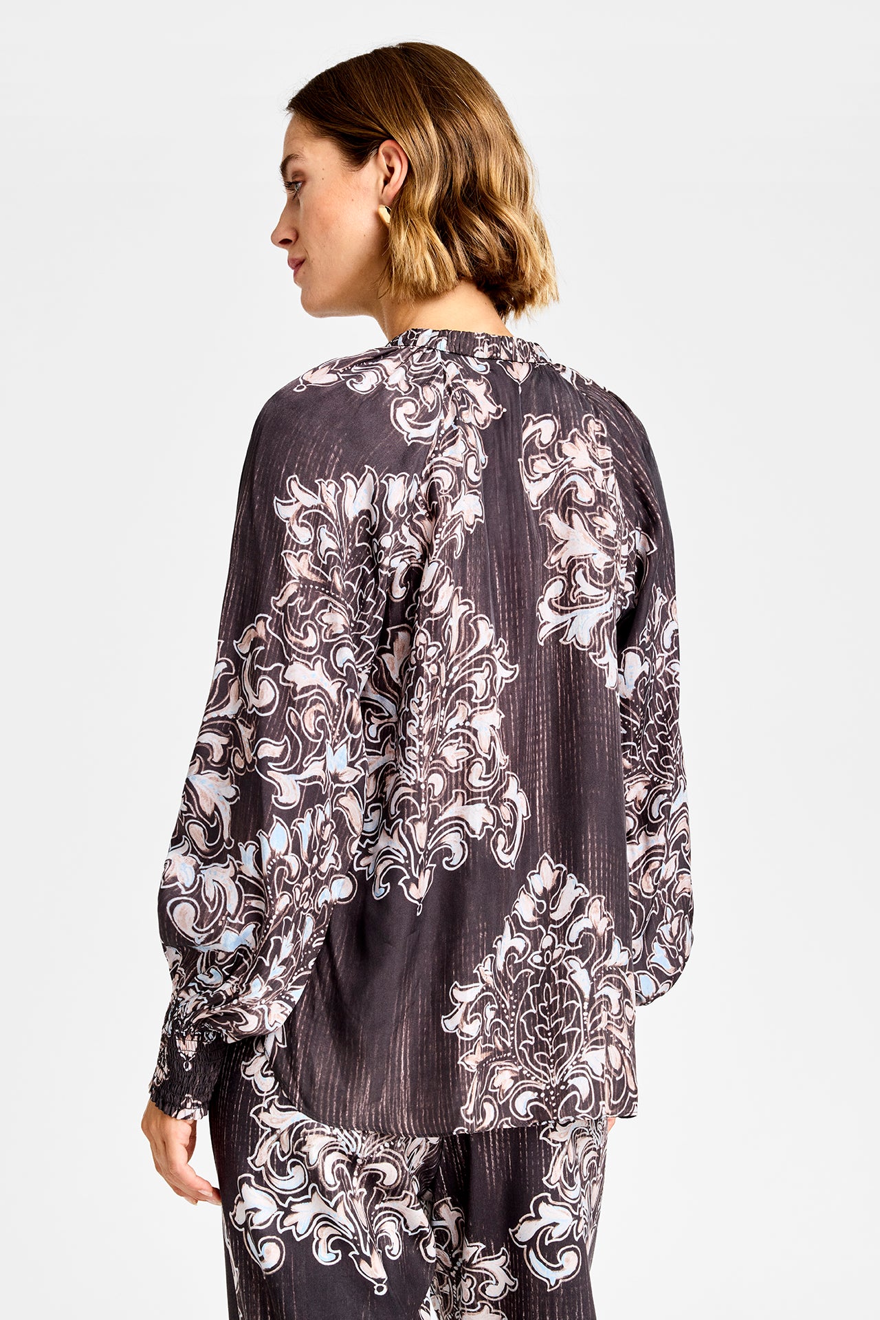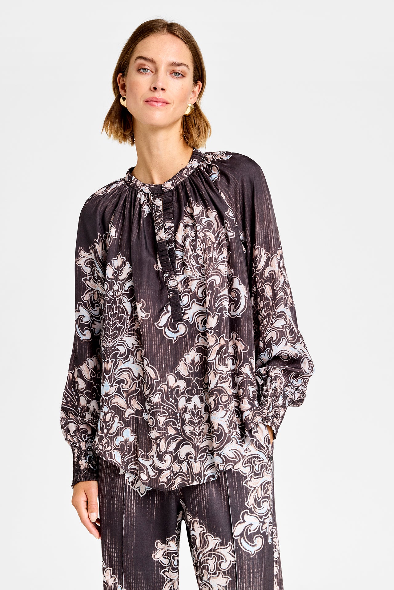 Printet Gustav bluse i brune toner. Blusen har en løs pasform med fine smock manchetter og kinakrave. Det brune print er virkelig flot til efteråret. Det er nemt at style med de matchende Marisa bukser, hvis du godt kan lide print på print. Men du kan også bryde looket med den fine Coya kappe til.