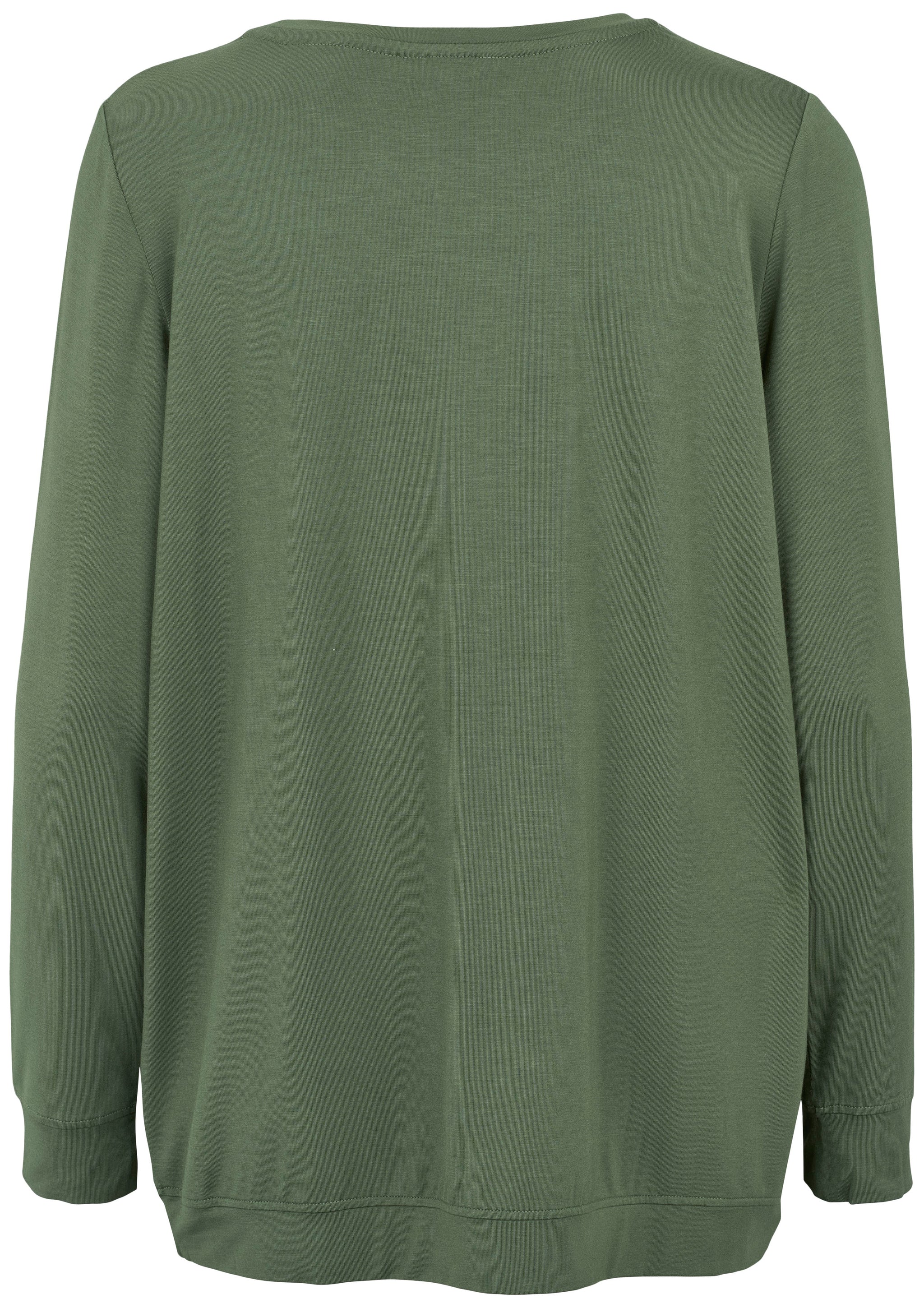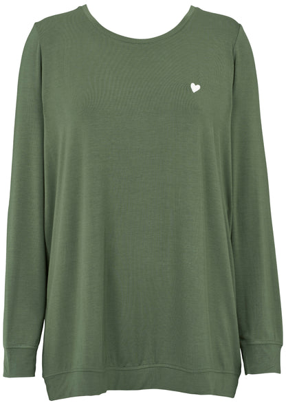 Fra Missyas Softness serie får du en lækker, grøn t-shirt i det blødeste materiale. T-shirten har lange ærmer og rund halsudskæring. Pasformen er rummelig, så den er perfekt at bruge som loungewear, når du bare skal slappe af derhjemme eller i sommerhuset.