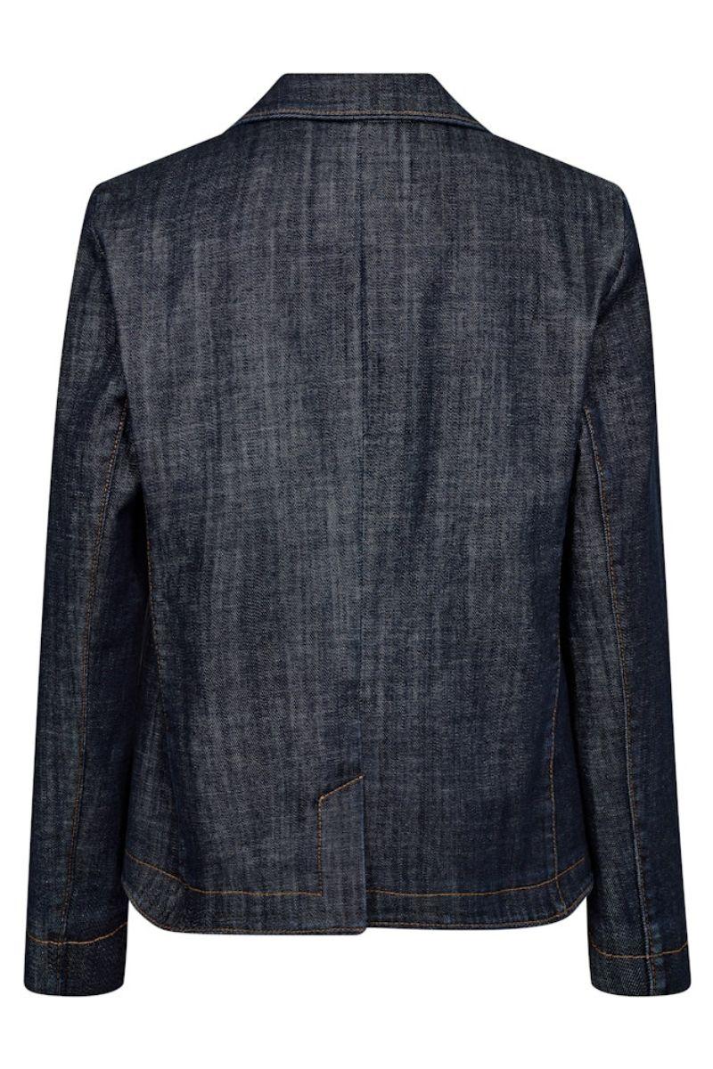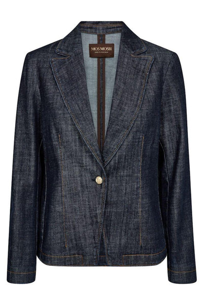 Cool denim blazser fra Mos Mosh i mørkeblå. Blazeren har bred revers og lukkes med en enkelt knap. Style med en hvid t-shirt som på billedet, hvis det bare skal være helt enkelt.