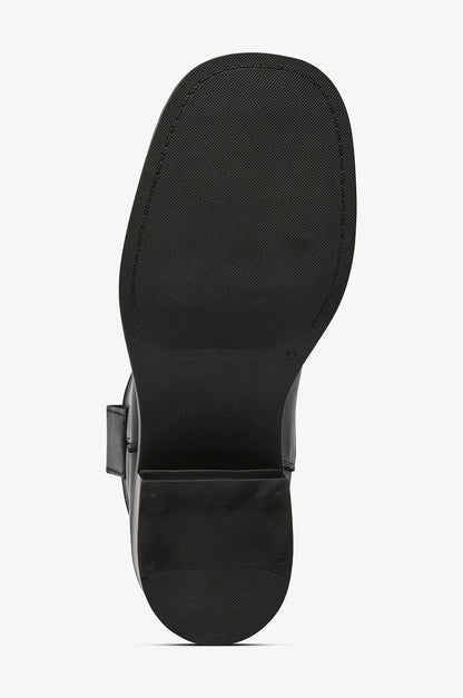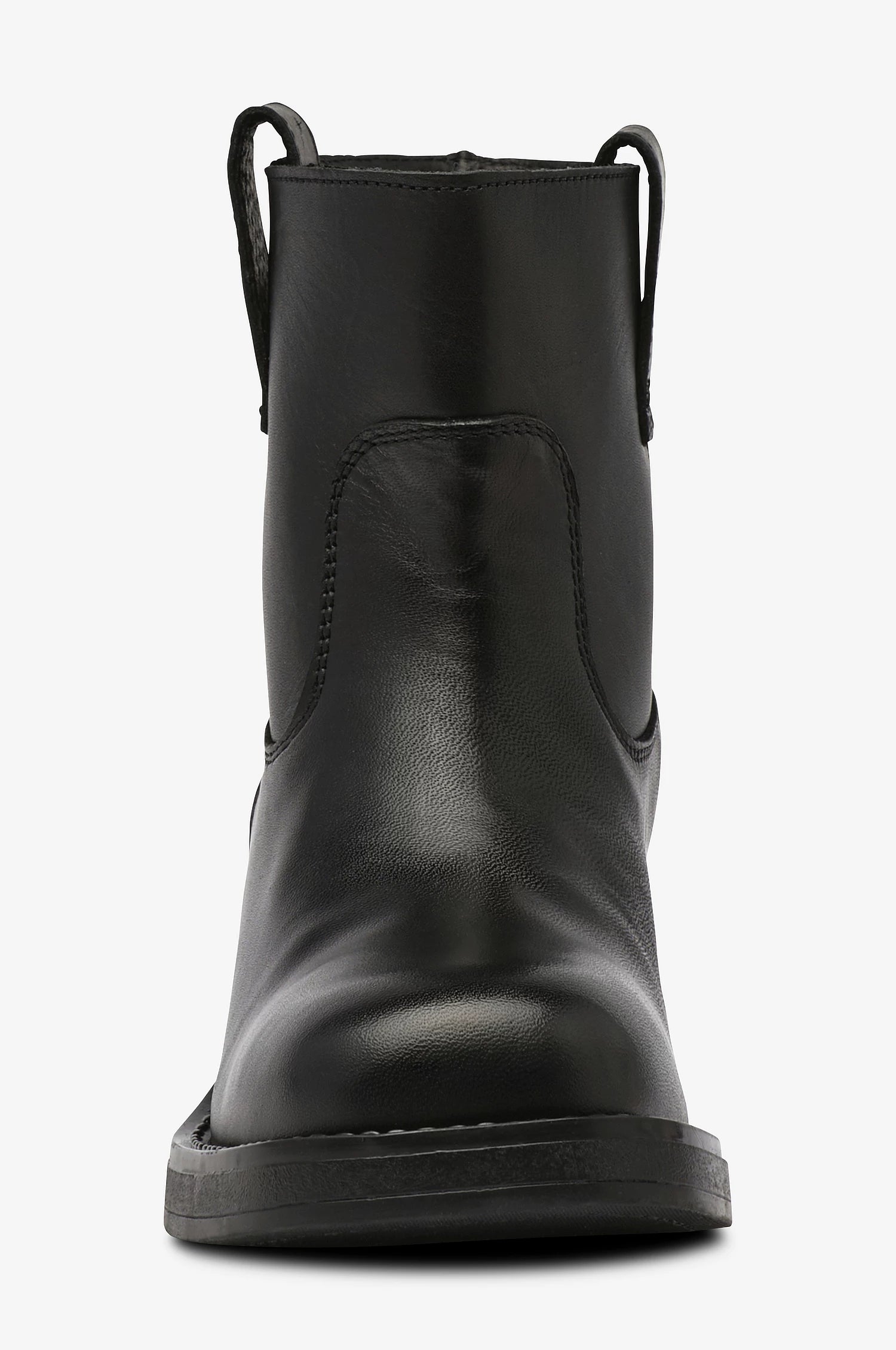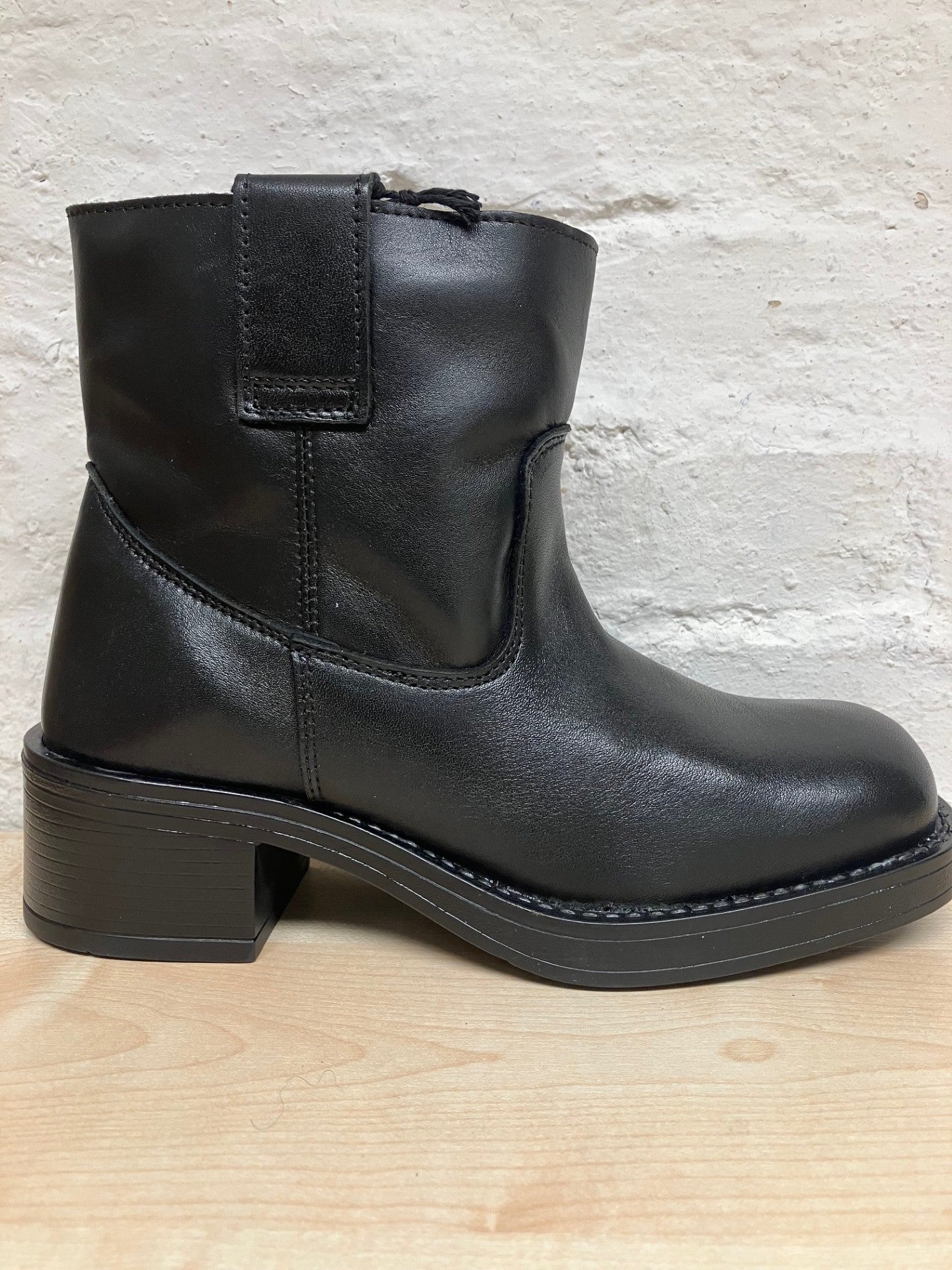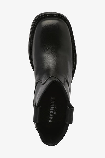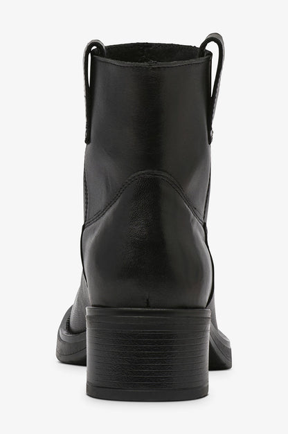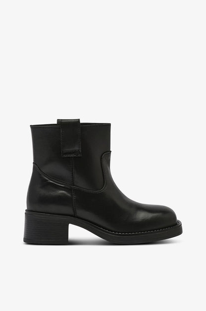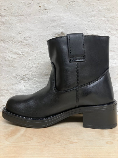 Kort læder støvle fra Pavement med rund snude og bred hæl. Støvlen har trækstropper i siderne, så den er nem at tage på og af igen. Style til jeans eller kjoler og nederdele. Det er flot med en knæstrømpe, der kan titte frem over støvlekanten.