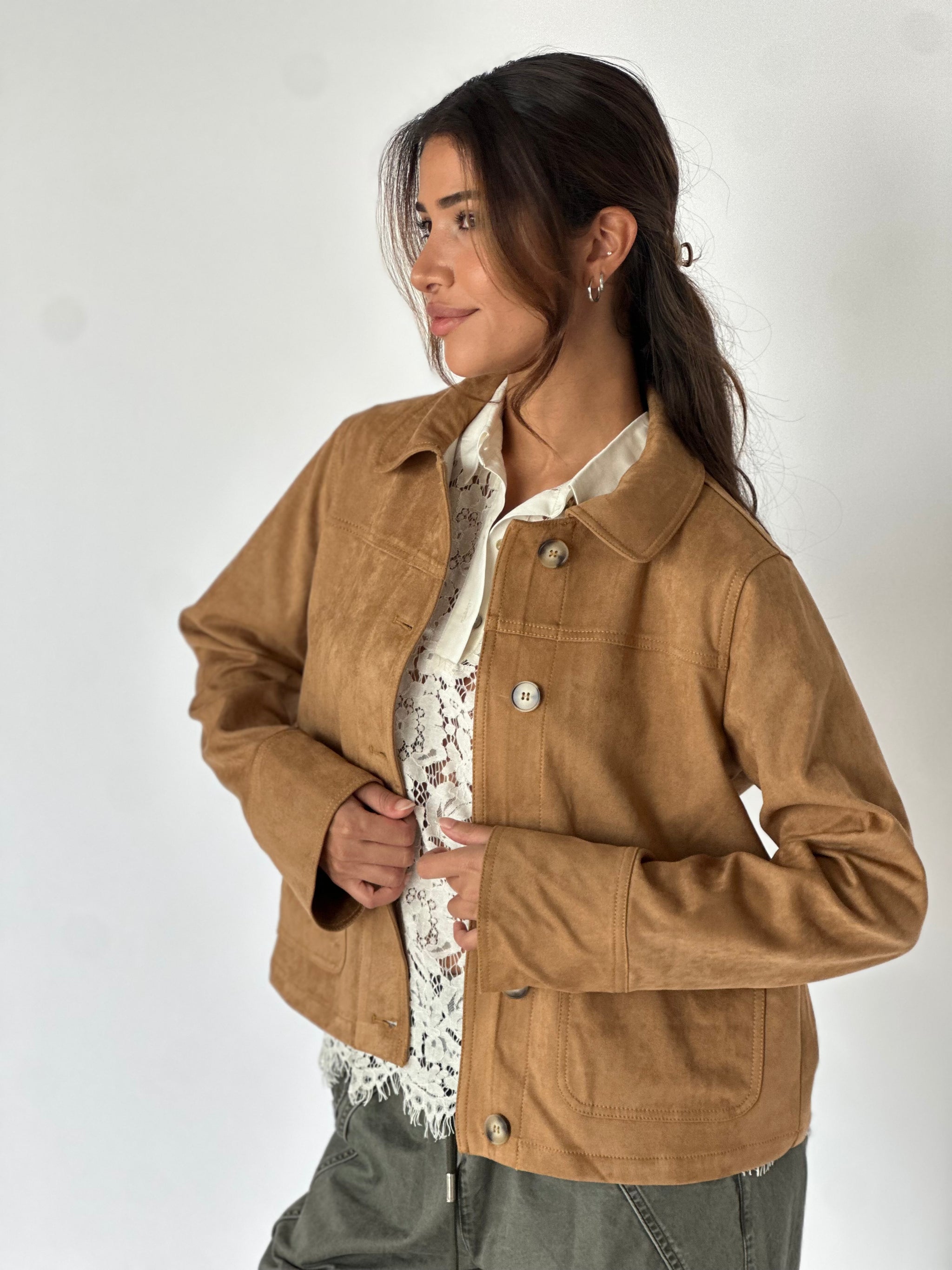 Fin indendørsjakke fra Continue i en varm camel farve. Jakken lukkes med knapper men kan fint bruges åbentstående over en skjorte eller strik. Jakken er ikke varm nok til at bruges udenfor, når det er koldt.