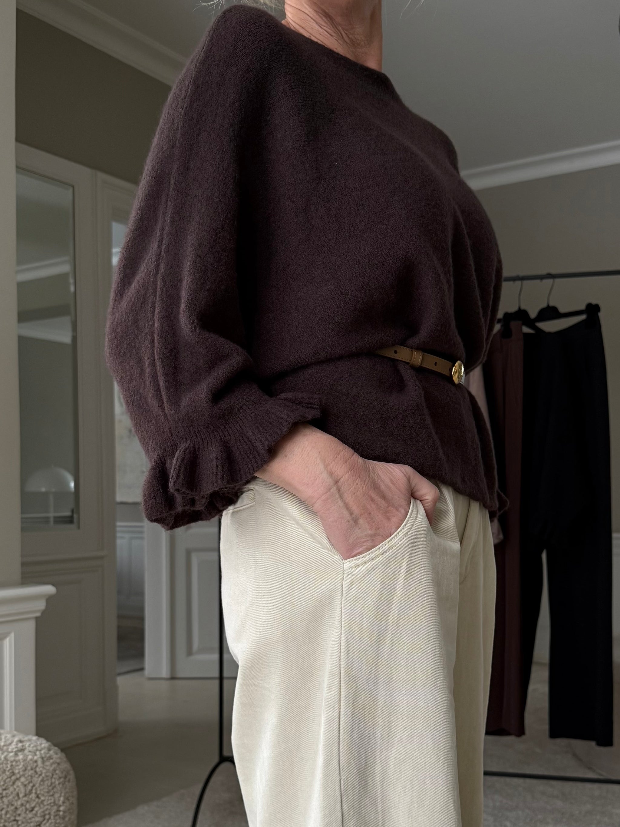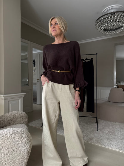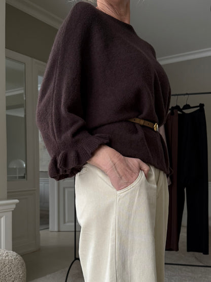 Sød strik kappe fra Marta du Château med bådudskæring og fine flæsekanter ved ærmerne. Blusen har flagermusærmer, der er skåret lavt, så du får den fine kappe facon. Sæt strik kappen til dine lysebrune bukser og skab et varmt efterårslook.Mål:Bryst: 73 cm