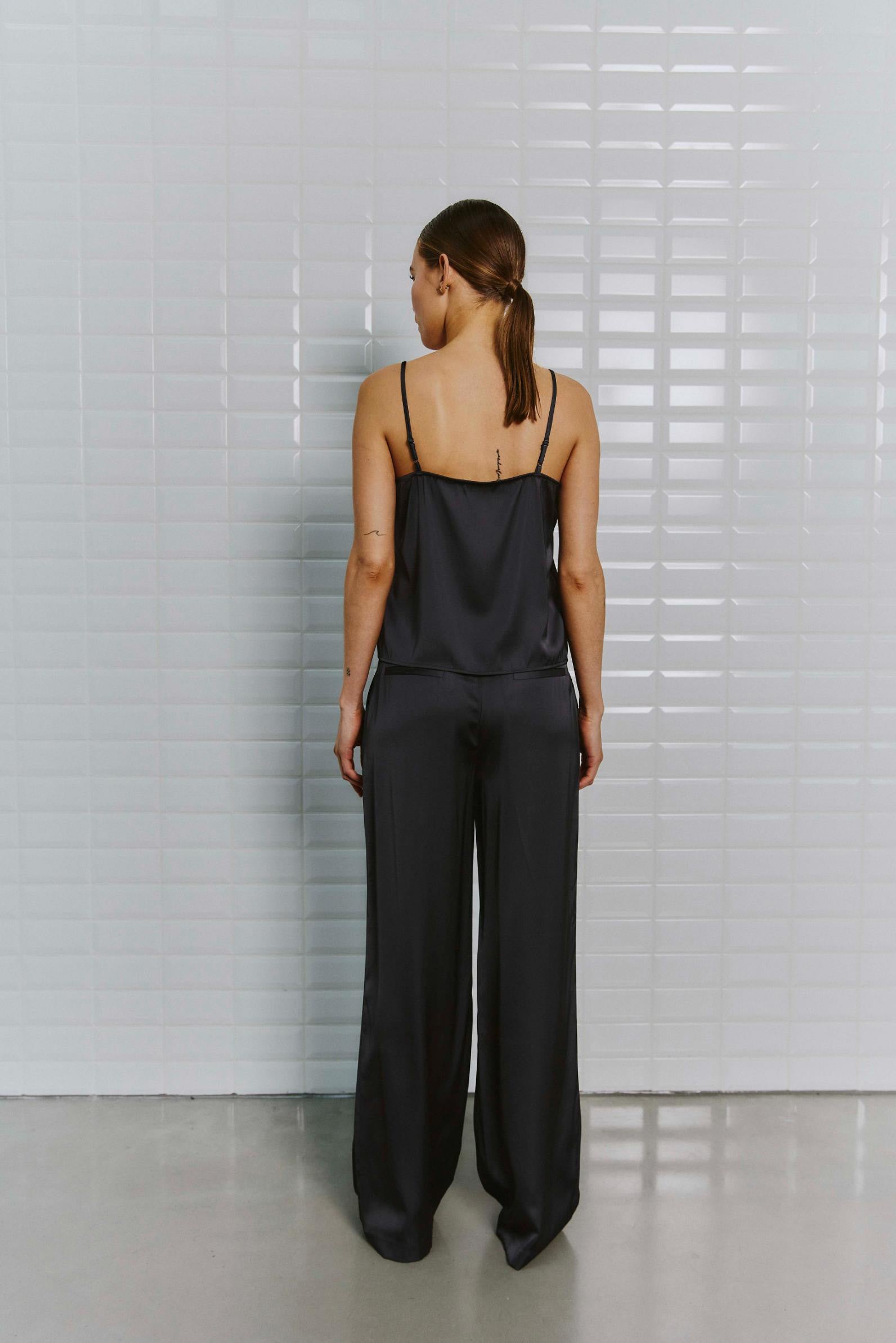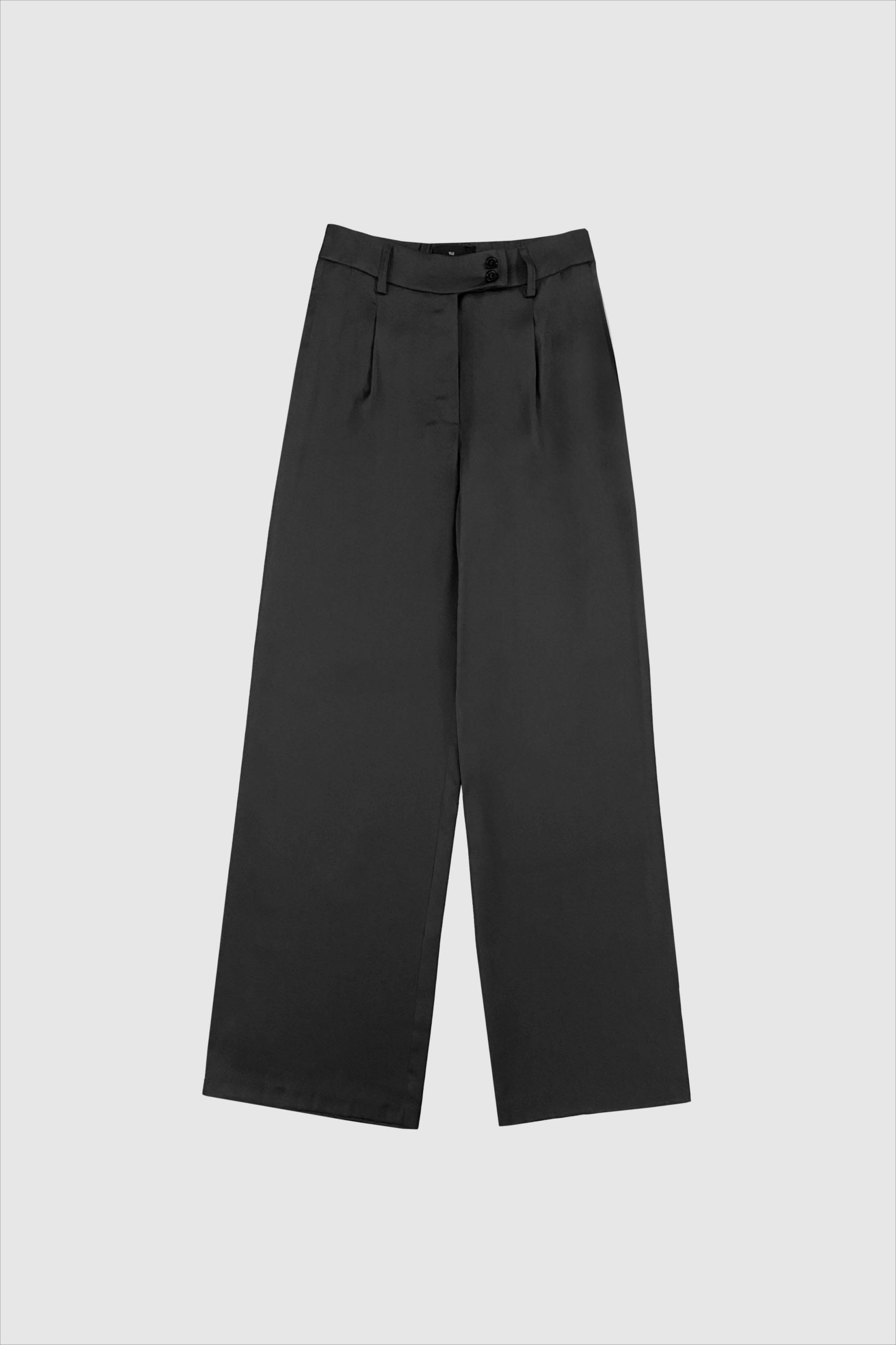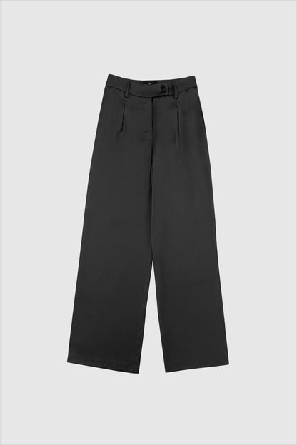 Elegante bukser i mørkegrå satin. Bukserne har brede ben og lommer i siderne. Den flotte shine gør bukserne velegnet til de kommende fester, sæsonen har at byde på. Style med den smukke Dagmar bluse i samme serie, så du har et flot sæt, du kan bruge til julefrokosten.