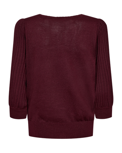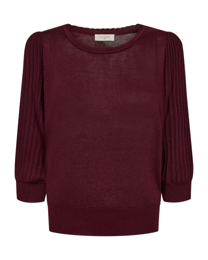 Fin glimmerbluse fra Freequent i trendfarven bordeaux. Blusen har rund halsudskæring og er afsluttet med ribkanter, så pasformen er i top. Blusen er super fin at style til et par flotte sorte bukser, så du får et elegant outfit. Du kan også sætte den til en nederdel med et par flotte strømpebukser og en støvle eller stiletter til.
