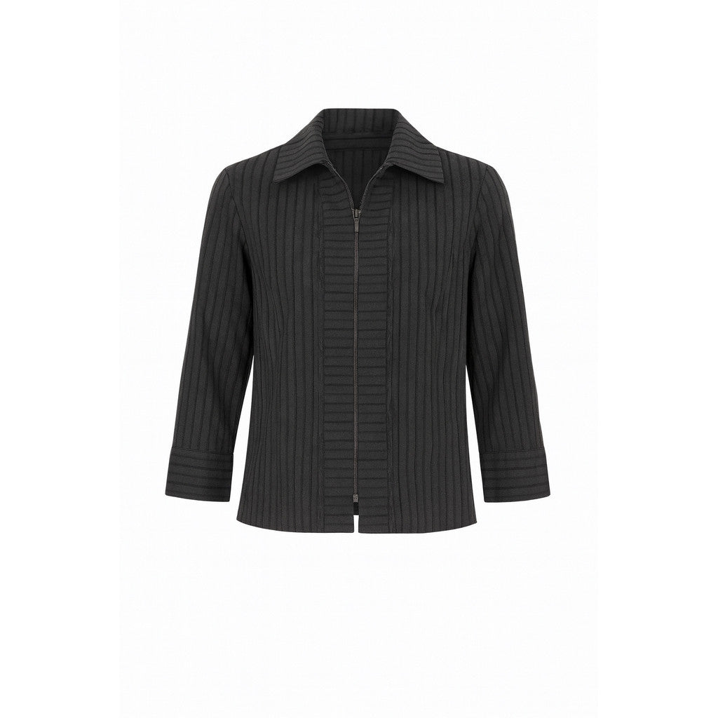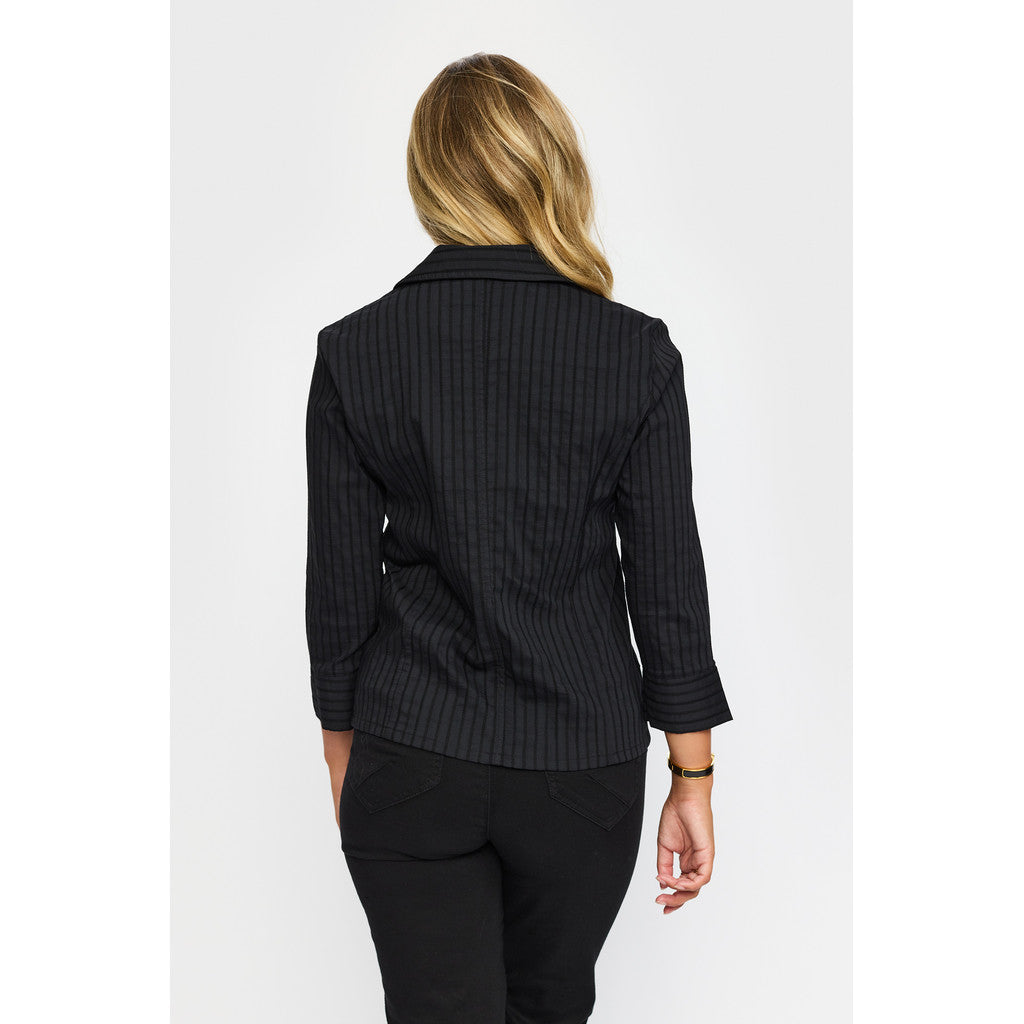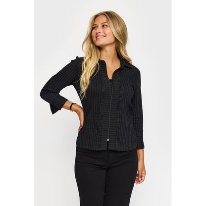 Lækker bluse fra 2-Biz i sort bomuldsblanding. Blusen er figursyet med gennemgående lynlås så du kan bruge den åbentstående med en lille top under eller bare lukket. Ærmerne er 3/4 lange og afsluttet med en lille slids, som en ekstra fin detalje.