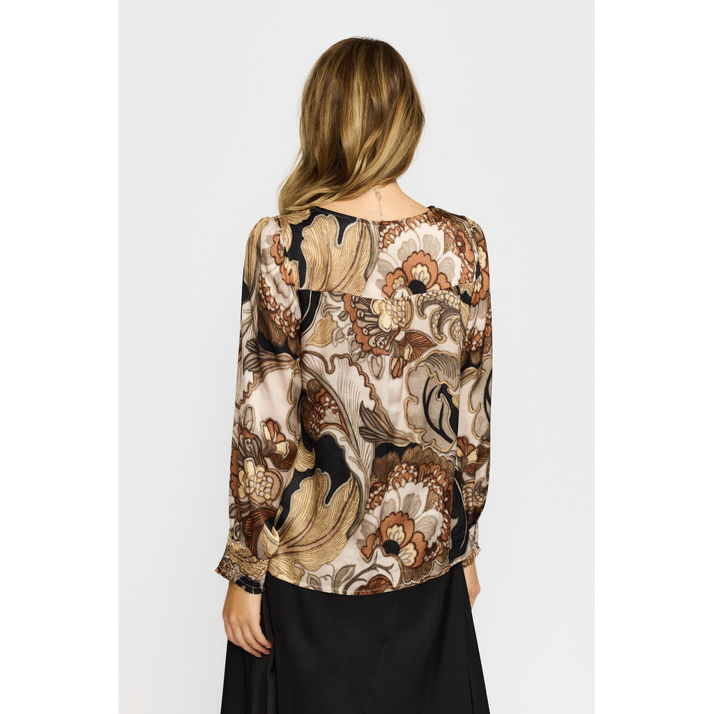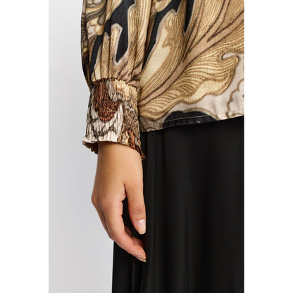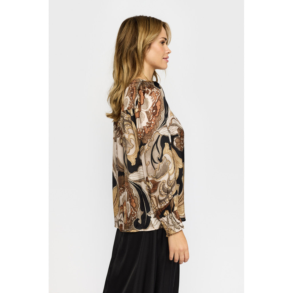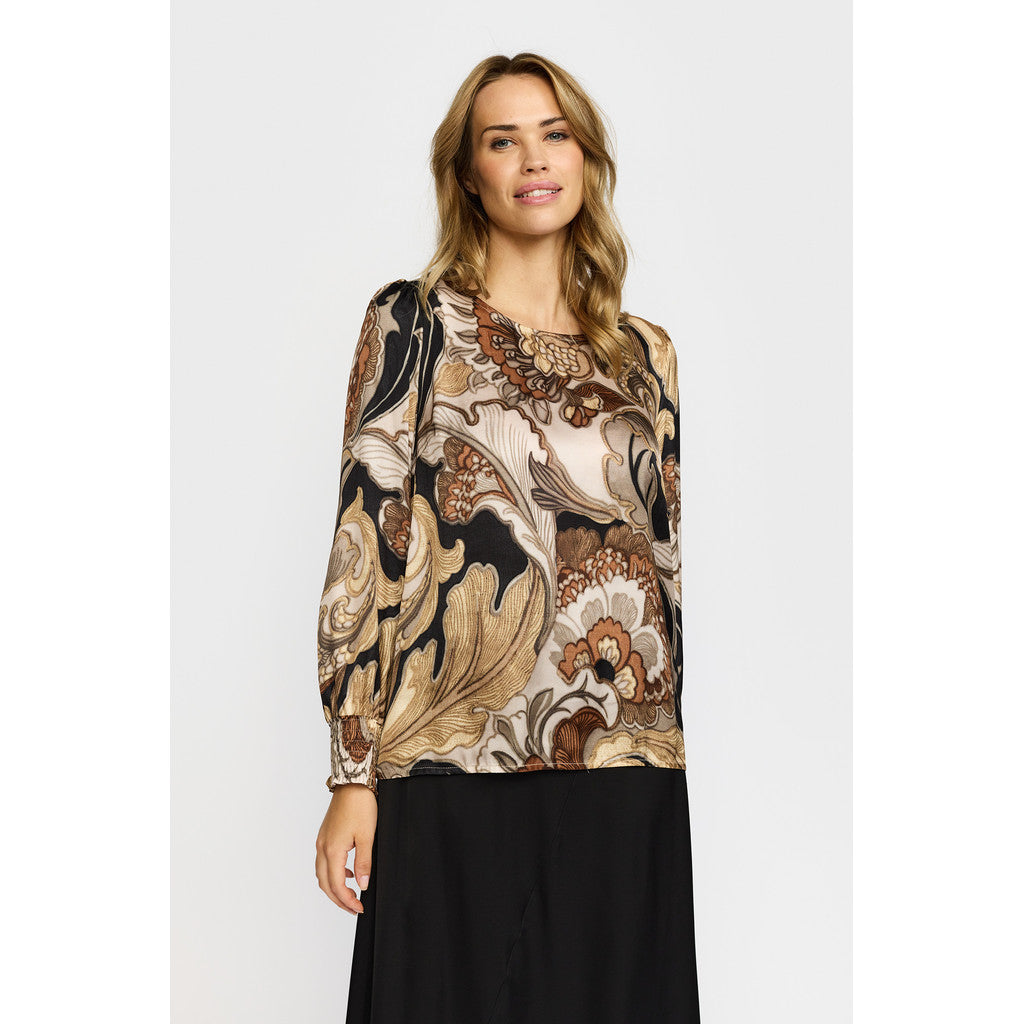 Flot 2-Biz bluse med print i gyldne toner. Blusen har en rummelig pasform så den er let og behagelig at have på. Kvaliteten er en lækker blanding af viskose og silke, som giver det mere eksklusive look. Style til dine sorte bukser eller nederdele for et flot aften look.