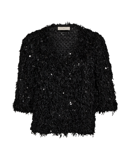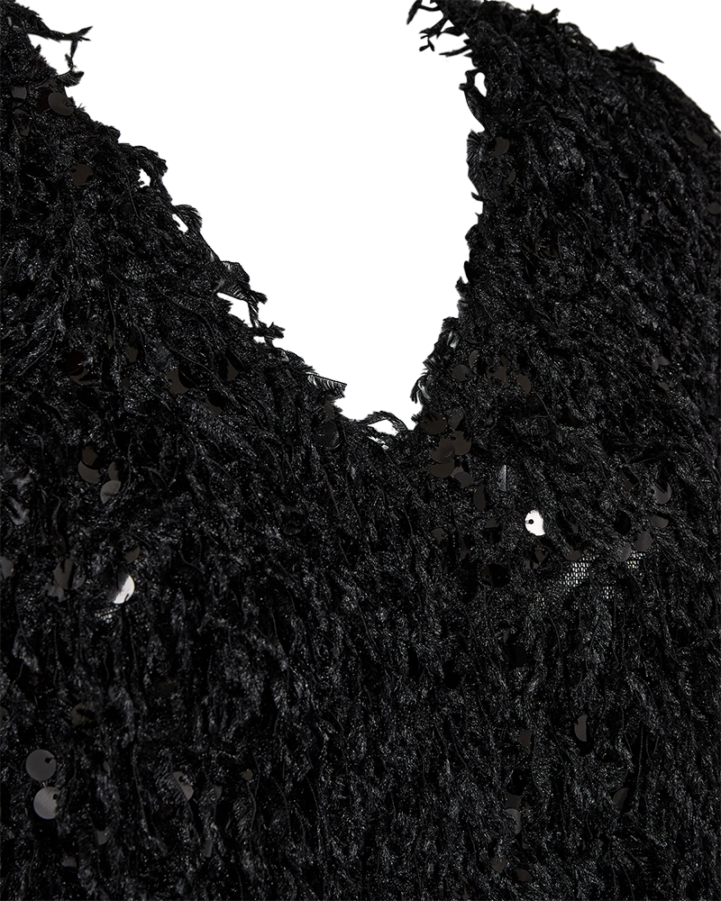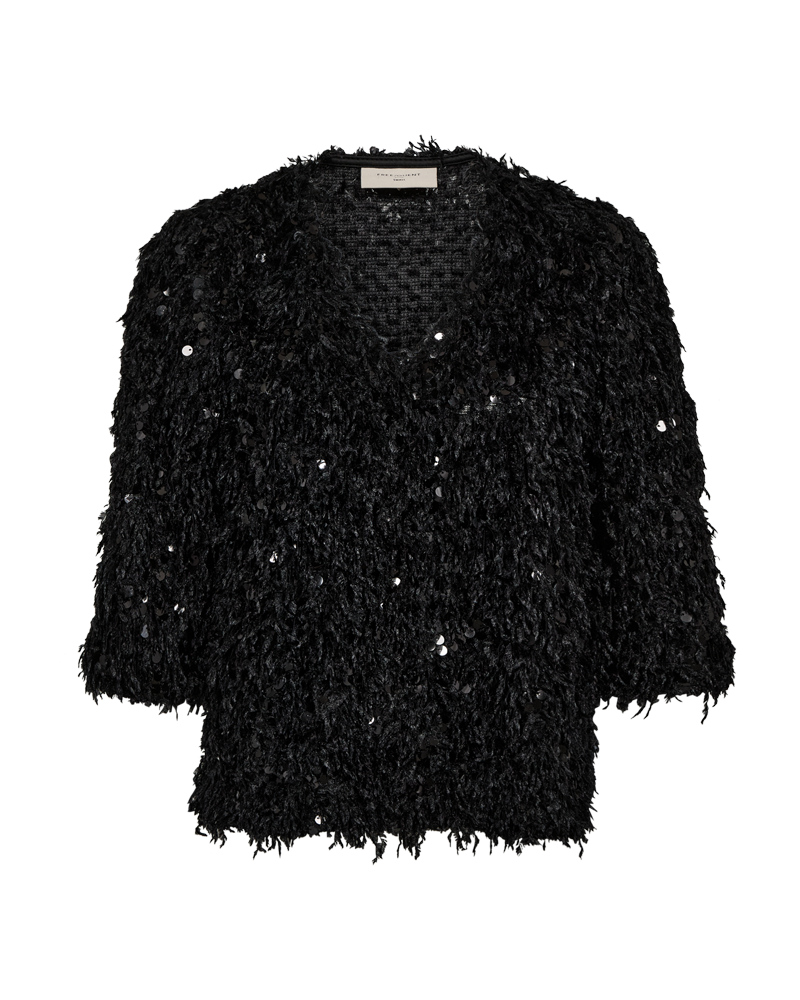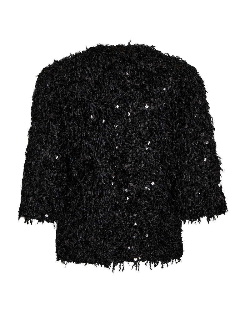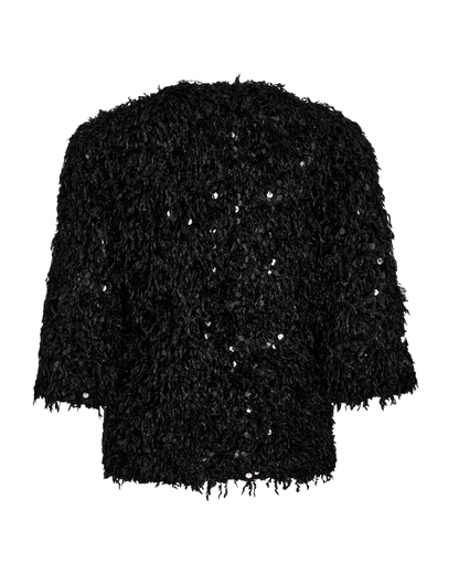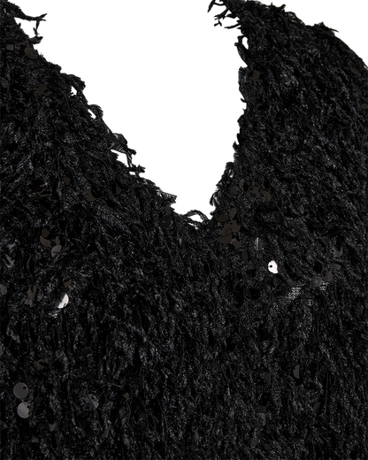 Festlig bluse til alle de kommende fester. Den sorte bluse har et frynset look med flotte pallietter. Super fedt til din pencil skirt eller et par sorte bukser. Du finder pallietblusen i flere fine farver, hvis det ikke lige skal være sort.