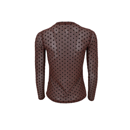 Mesh bluserne trender rigtigt meget denne sæson. Her får du en flot, mørkebrun bluse med tone-i-tone prikker. Blusen sidder helt til men har godt med stræk i. Style den transparente mesh bluse under dine strik kapper, så ærmerne kan titte frem. Du kan også gøre dit outfit mere vovet og bare style en sort eller brun bh under og sætte din blazer over.Measurements S/M½ Chest: 42 cm.Length: 62 cm.