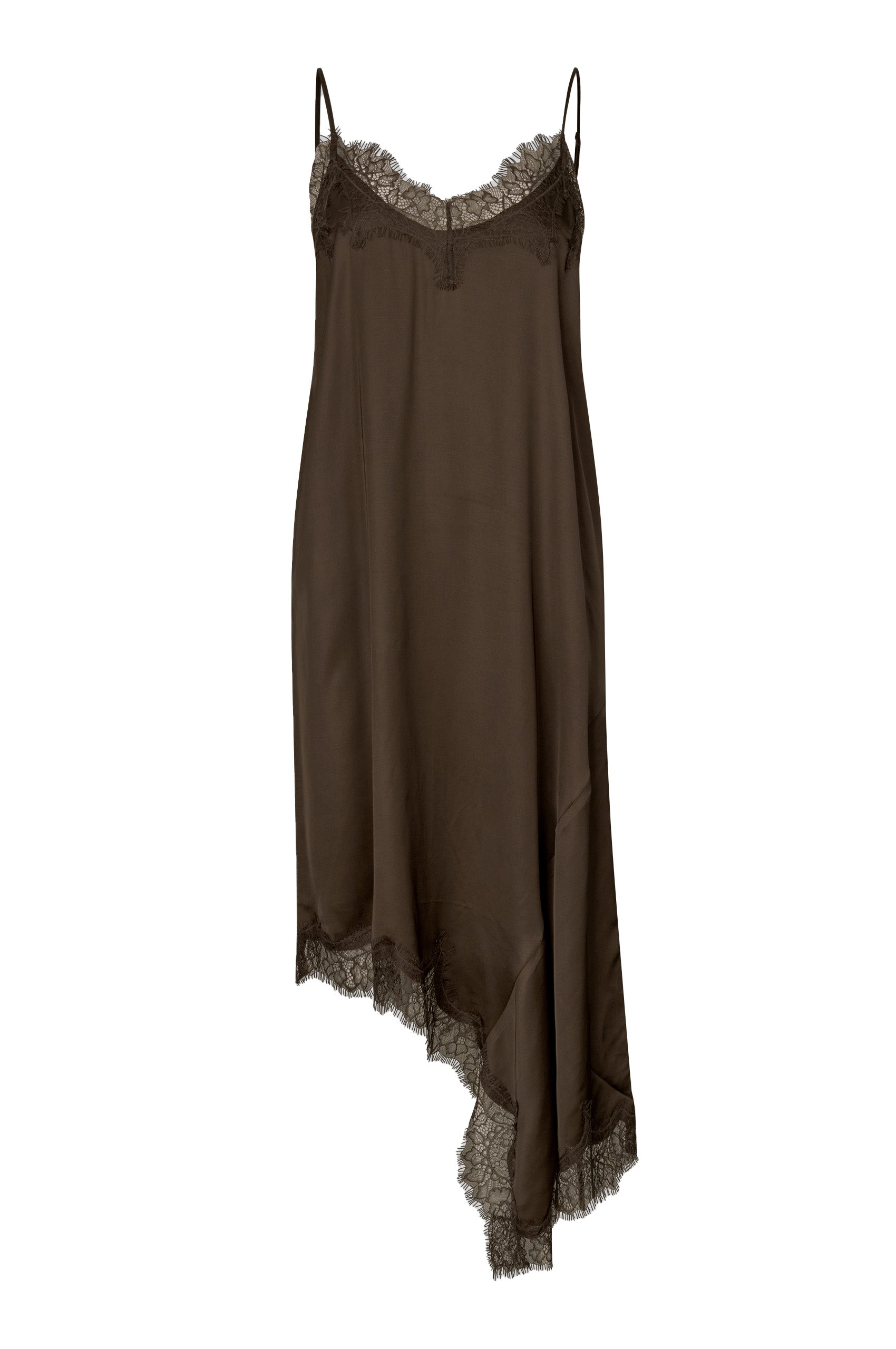 Elegant kjole fra Second Female i mørkebrun satin. Kjolen har det asymmetriske snit, der vinder frem i modebilledet lige nu. Med de fine blonder i både halsudskæring og bund, får du en virkelig feminin kjole. Style den over dine bukser, så det flotte snit bliver fremhævet.