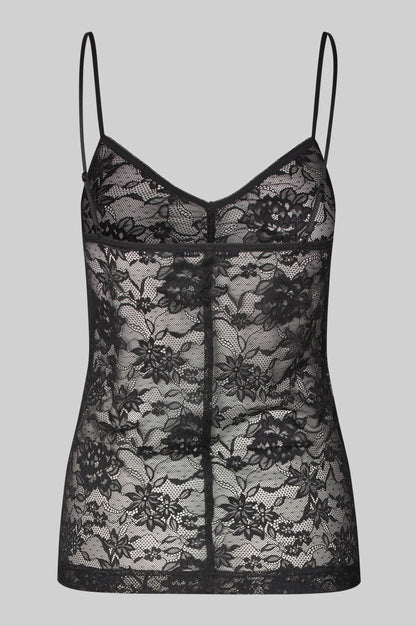 Elegant blondetop fra Second Female. Toppen har helt smalle stropper og er transparent på den sexede måde. Style toppen med en sort bh under og sæt din blazer eller glimmer cardigan over. Toppen er blød og lækker at have på. Virkelig flot til de kommende julefrokoster. Eller måske er det blondetoppen, du skal have på til nytårsaften.
