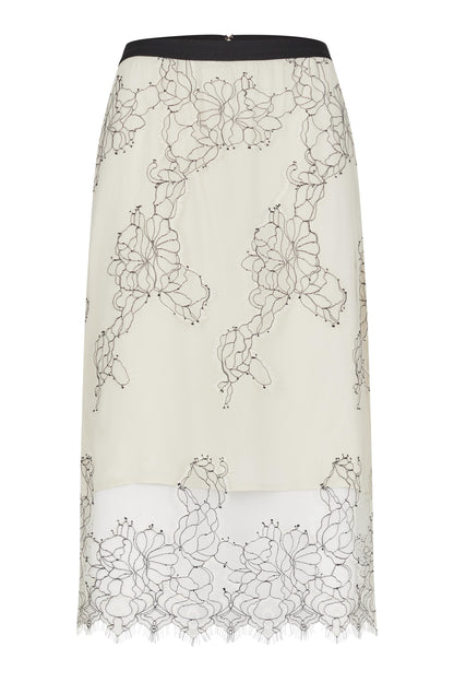 Blondenederdel fra Second Female i flot ecru med detaljer i sort kontrast. Nederdelen har elastik i taljen og lukkes med skjult lynlås bagpå. Der er foring i næsten hele længden, så den ikke bliver gennemsigtig i det øverste stykke. Blondenederdelen har en tætsiddende pasform. Style med den matchene blondeskjorte, hvis du gerne vil have et helt sæt. Du kan også style med en sort top og sætte fokus på kontrasterne i dit outfit. Oplagt til julefrokosten eller nytårsaften.