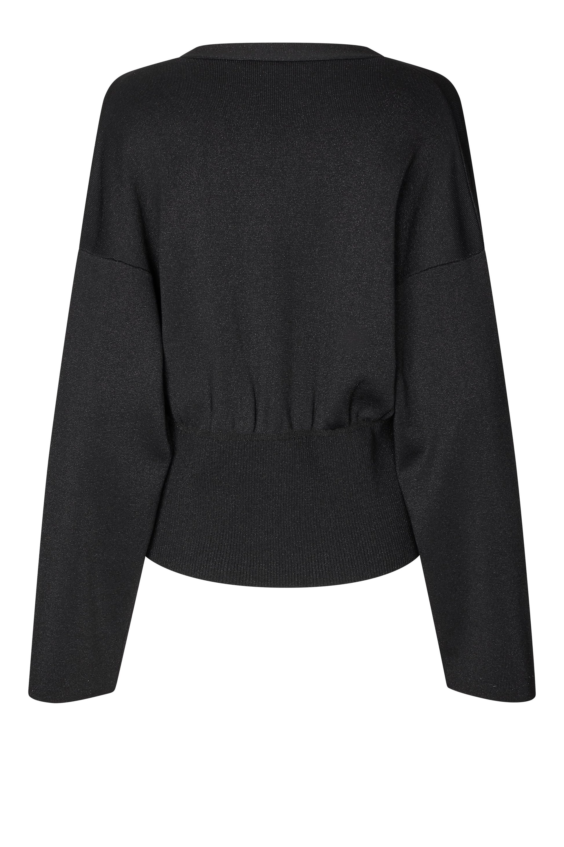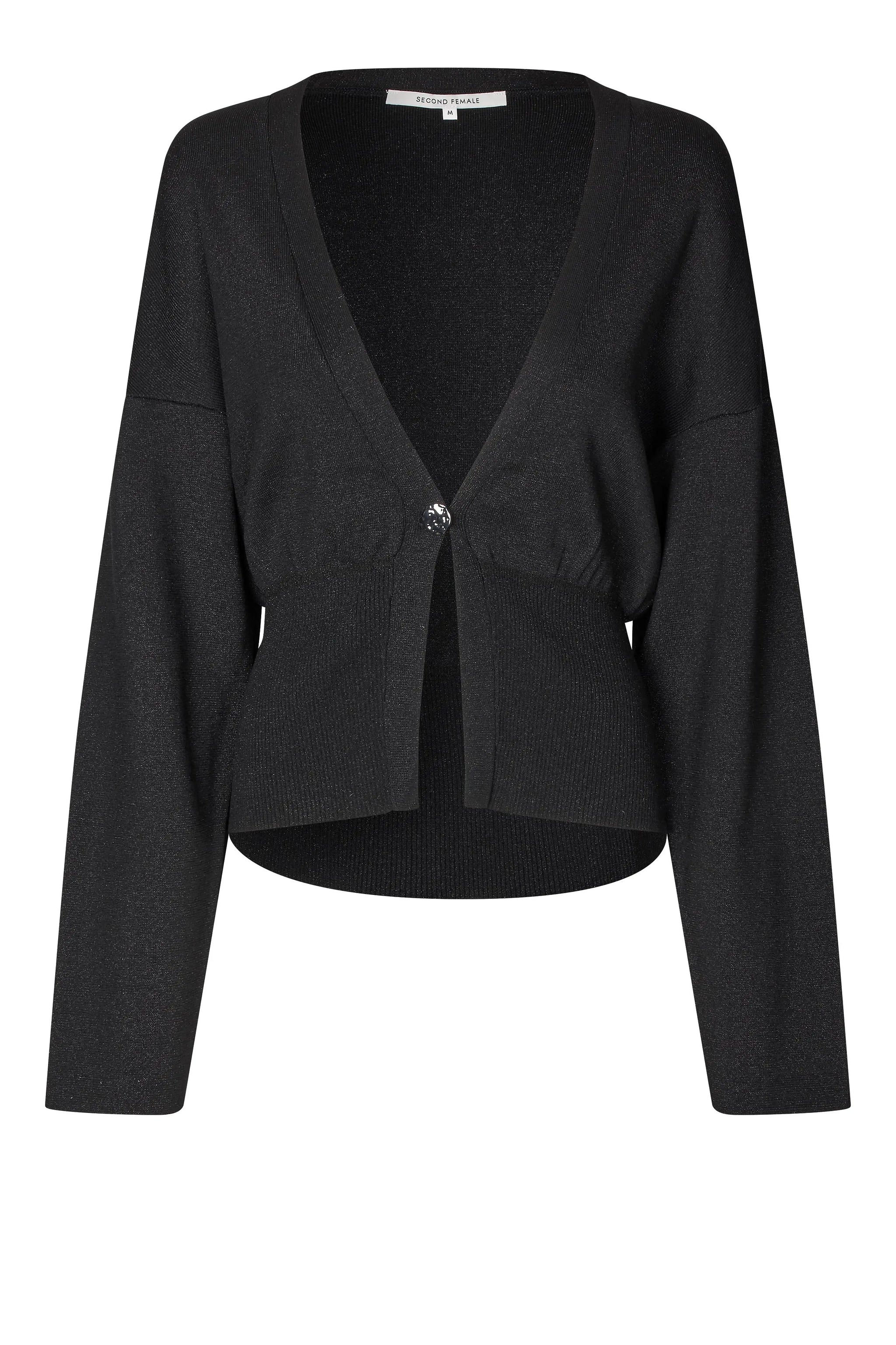 Elegant glimmer cardigan fra Second Female. Cardiganen lukkes med en enkelt sølvknap i organisk look. Cardiganen er taljeret, så du virkelig sætter fokus på din figur på en flot måde. Style til en lækker nederdel eller dine pæne, sorte bukser.