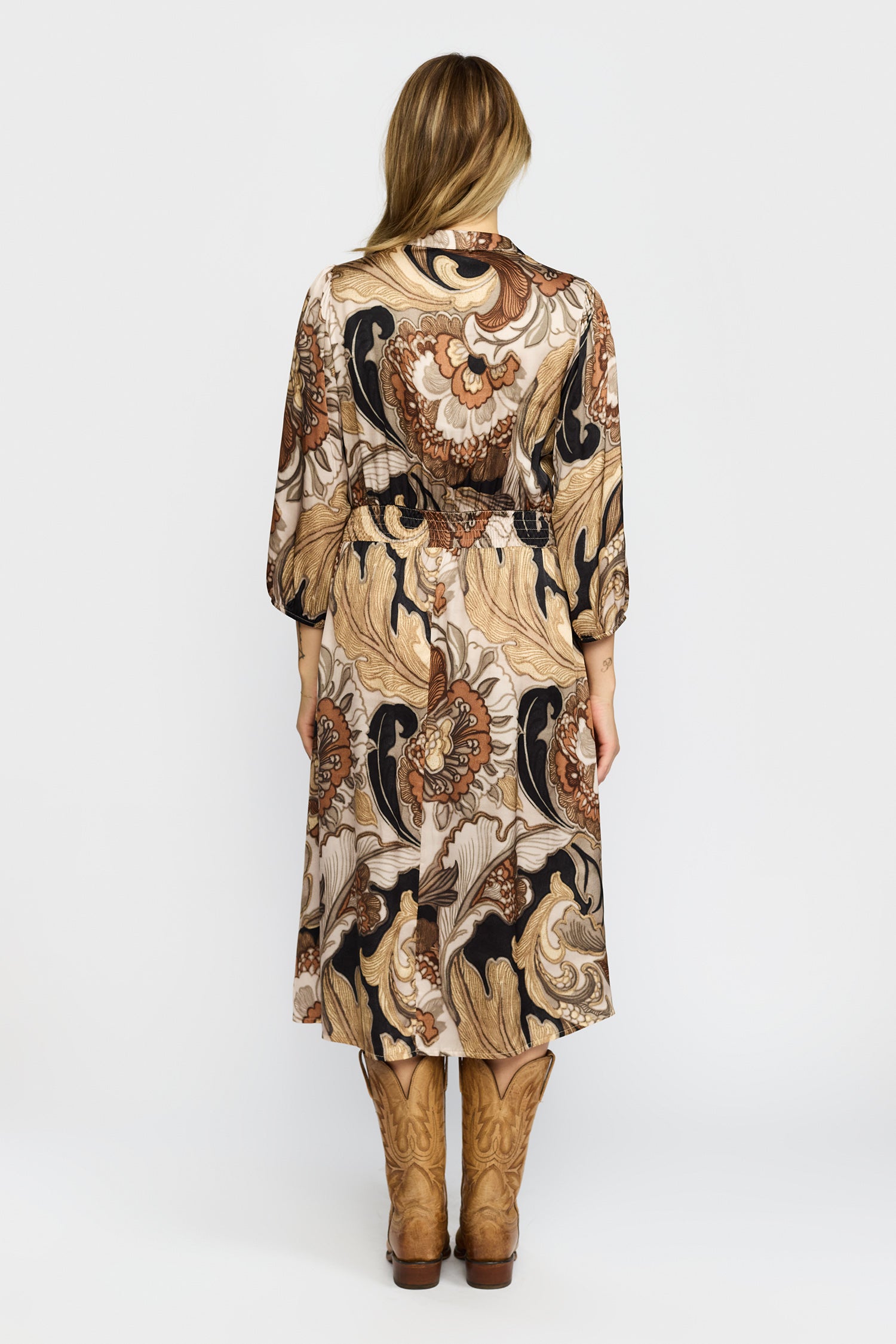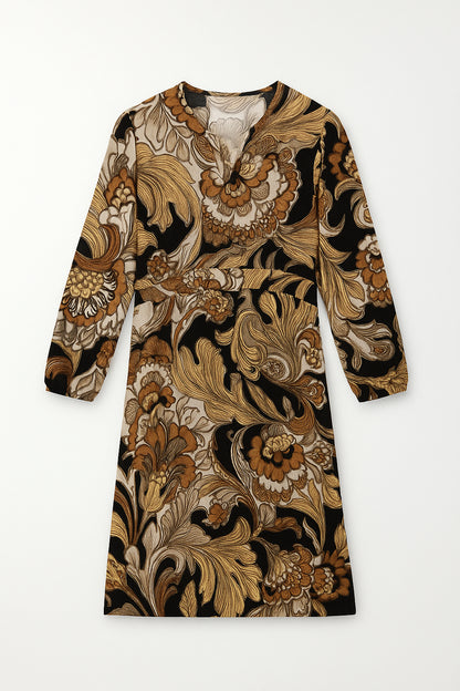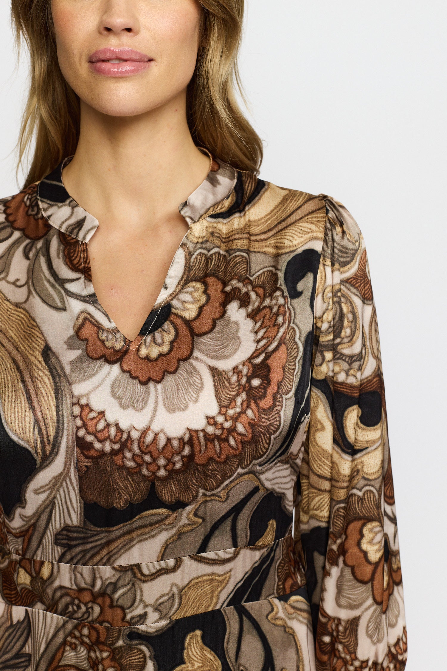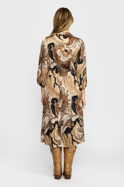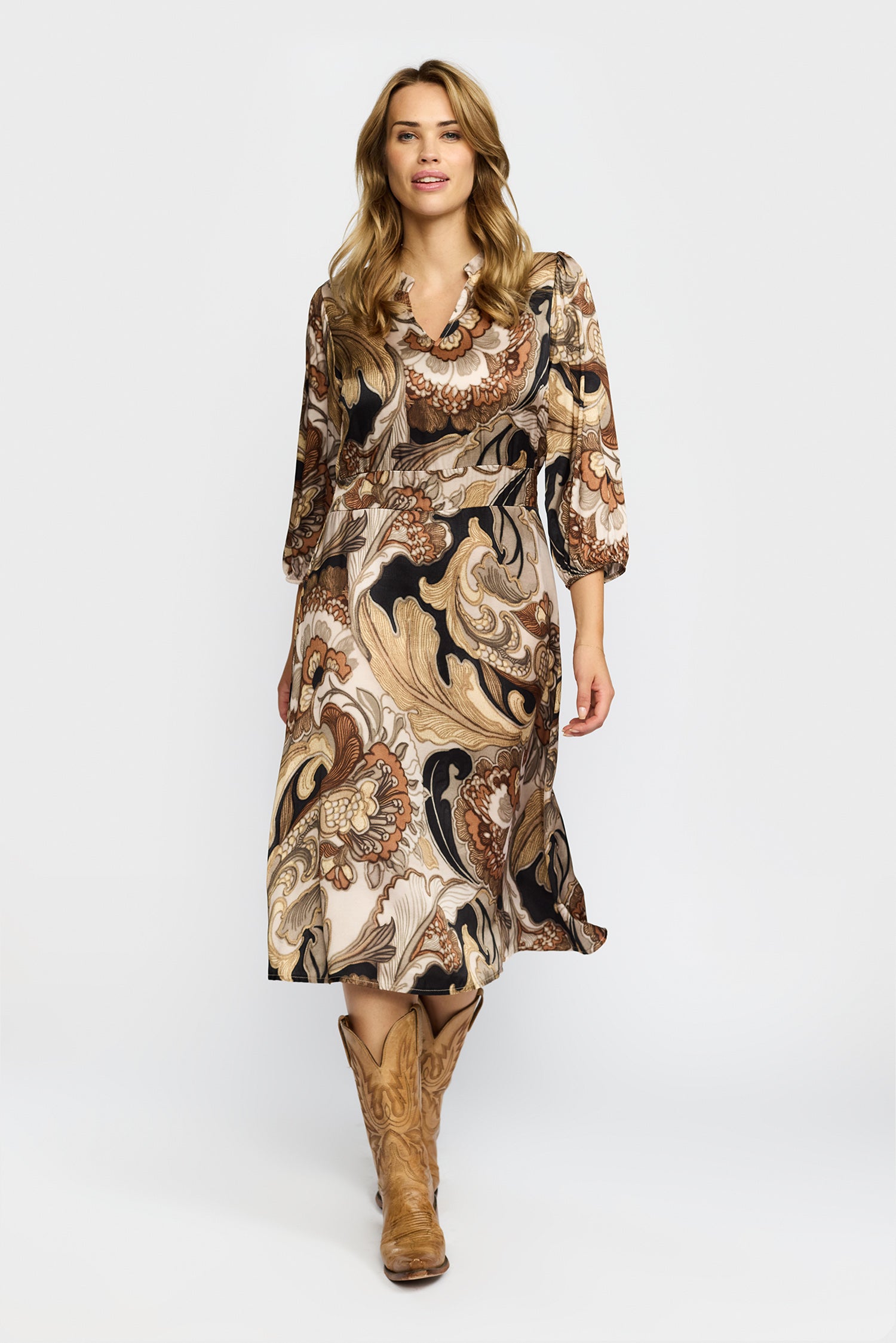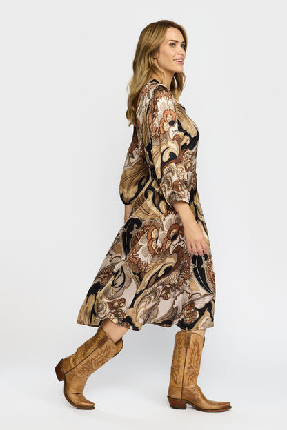 Lækker efterårskjole fra 2-Biz i varme toner. Kjolen er skåret, så den får et taljeret snit, med flot fokus på taljen. Style med dine brune støvler og sæt gerne en strik til, hvis du vil bruge kjolen til hverdag.