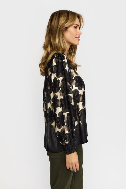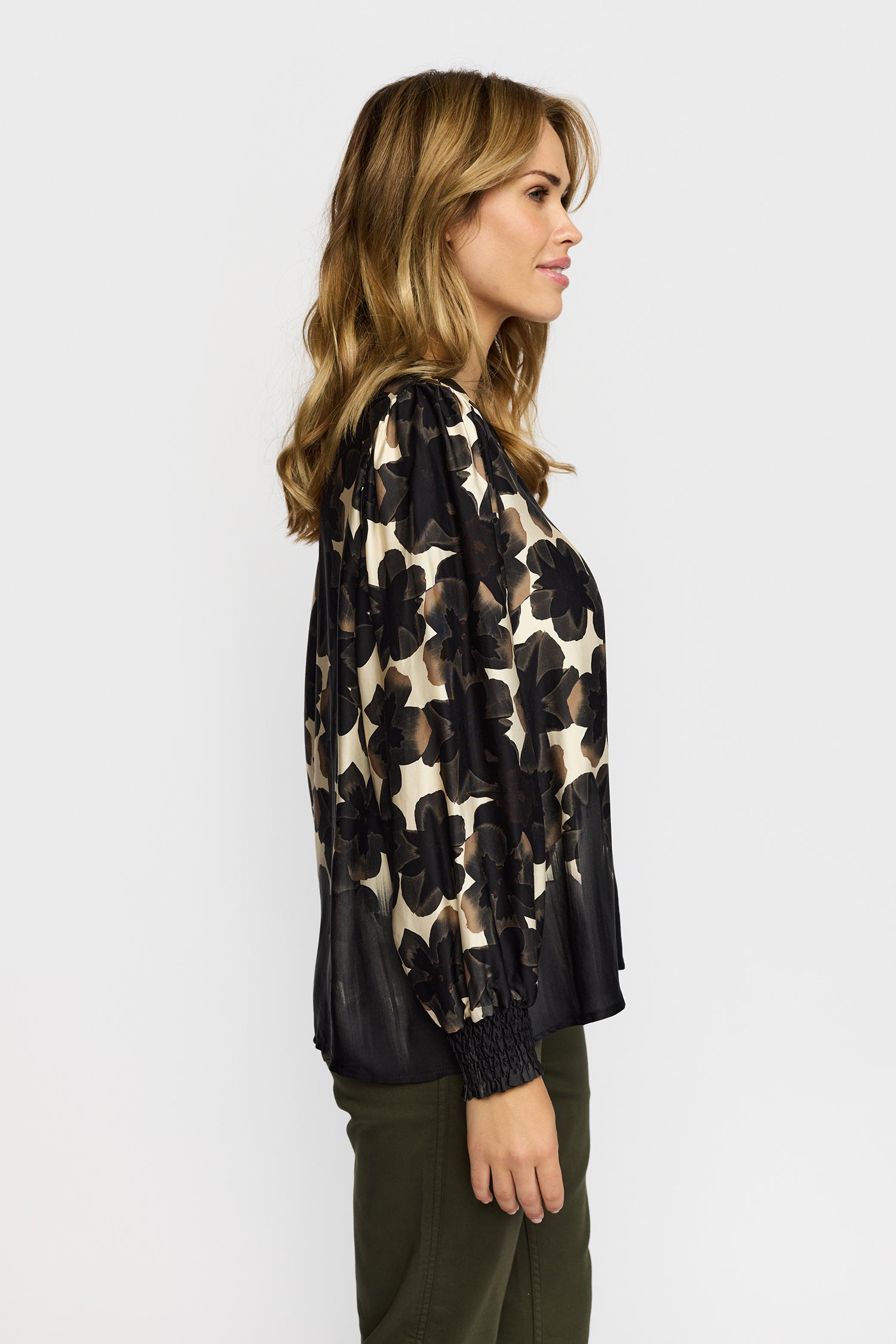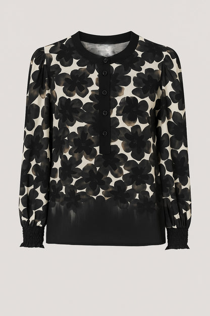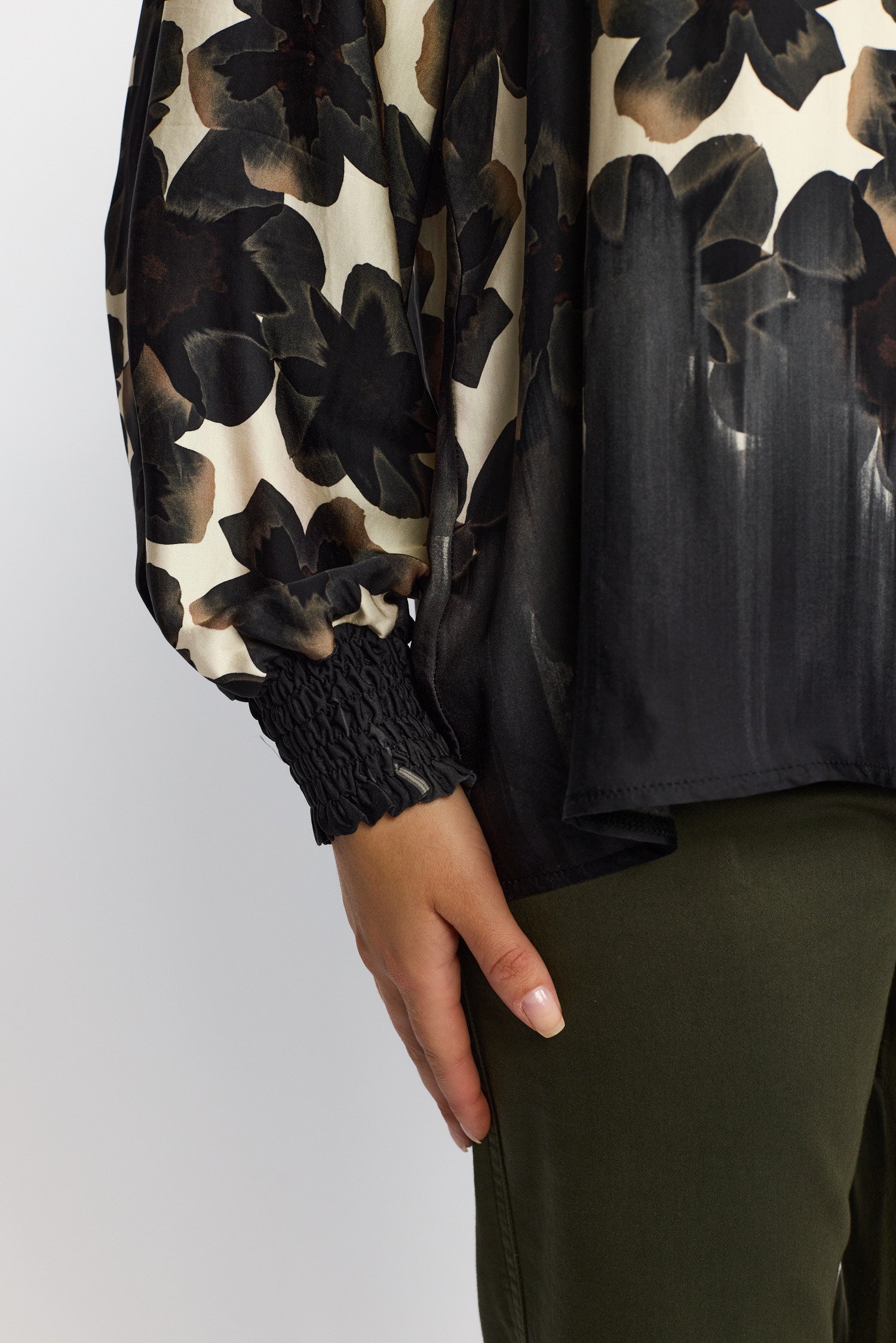 Smuk bluse fra 2-Biz med blomstret print. Blusen har smock manchetter i sort, som en fin afslutning på ærmerne. Style til dine sorte eller brune bukser. Der er knapper ned til brystet.