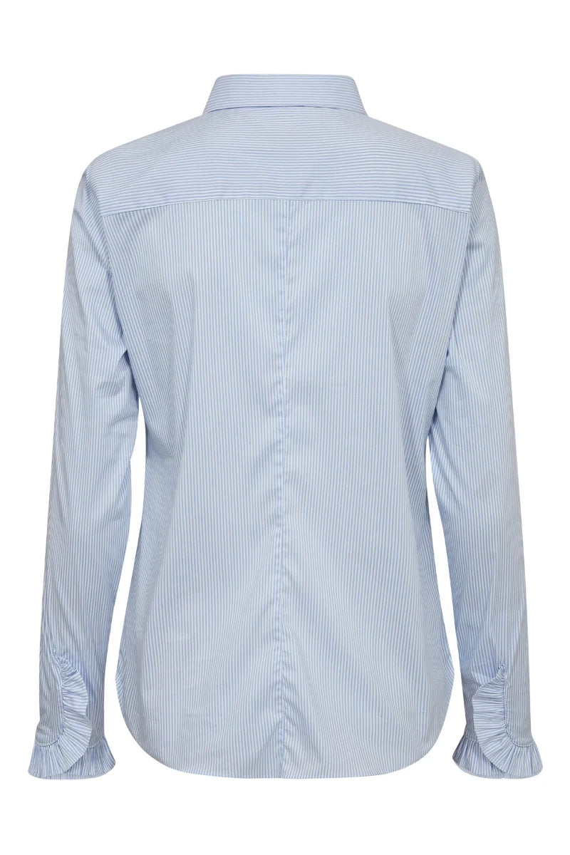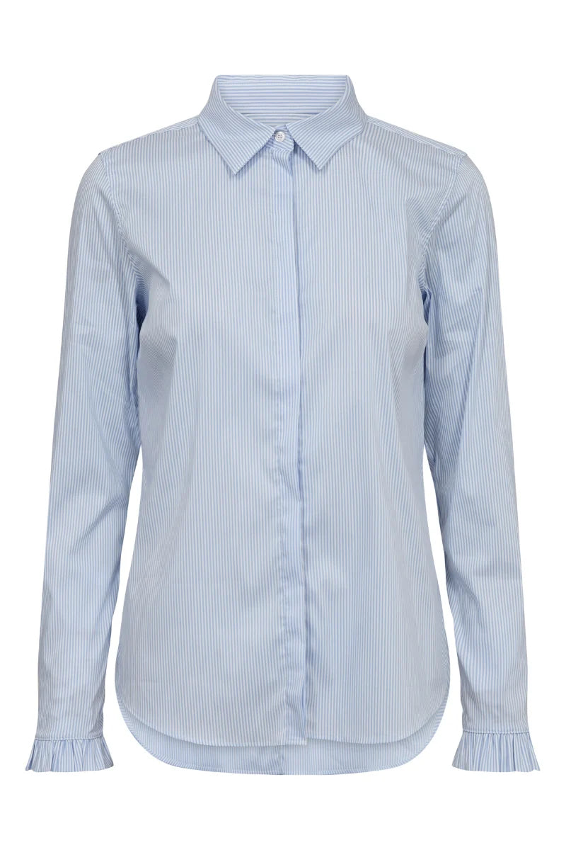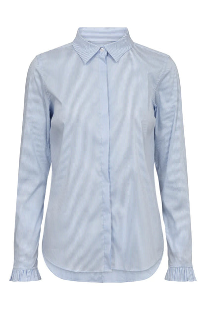 Blå stribet skjorte fra Mos Mosh i lækker bomuld. Skjorten sidder flot til og har de fineste flæser ved ærmerne. En virkelig lækker skjorte til dine mørkeblå eller sorte jeans. Den blå-stribede skjorte er også super flot til grå eller brune bukser - der fremhæver du den blå farve på en virkelig flot måde i den styling.