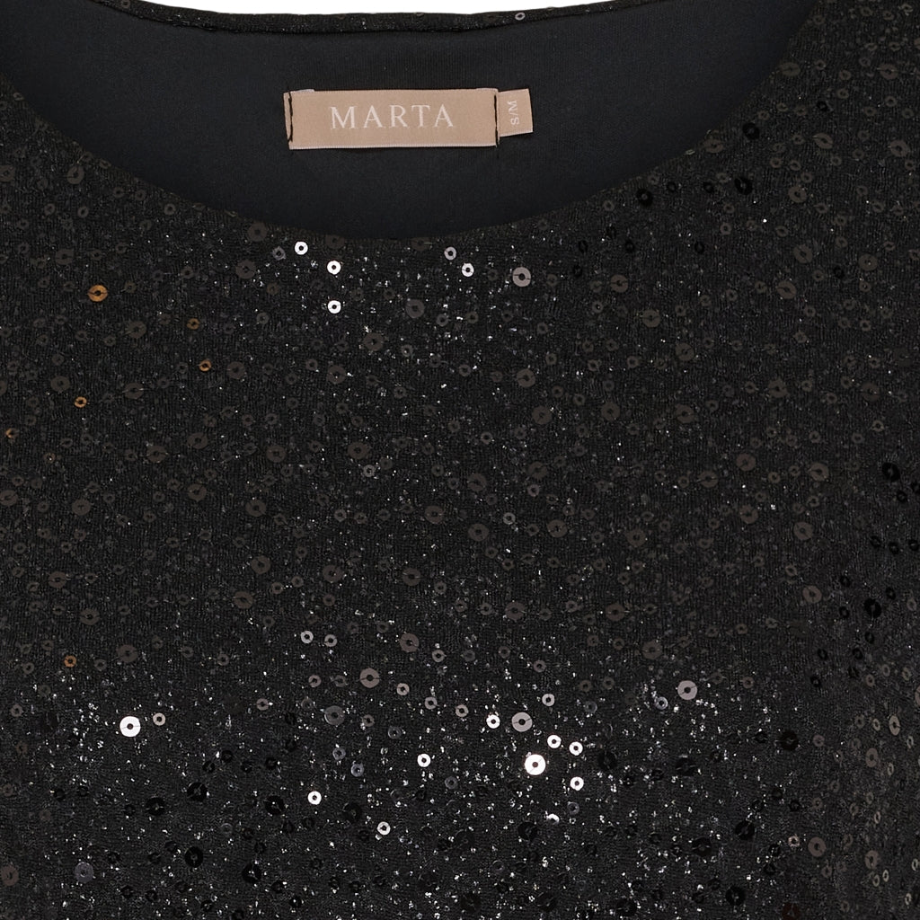 Festlig pallietkjole fra Marta du Château. Kjolen har korte ærmer og rund halsudskæring. Den taljerede facon er med til at give kjolen et super lækkert udryk. Perfekt til julefrokosterne eller til nytårsaften. Style med høje stiletter og fine øreringe.