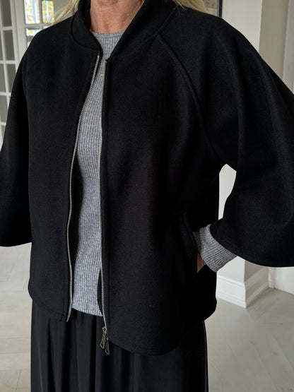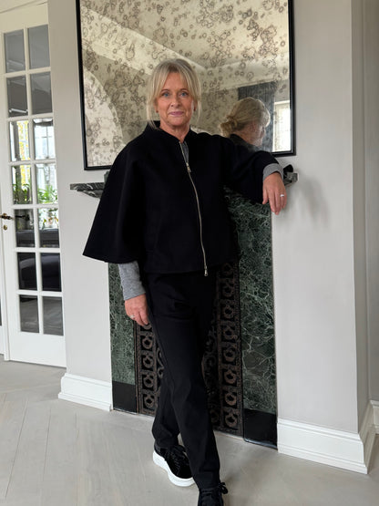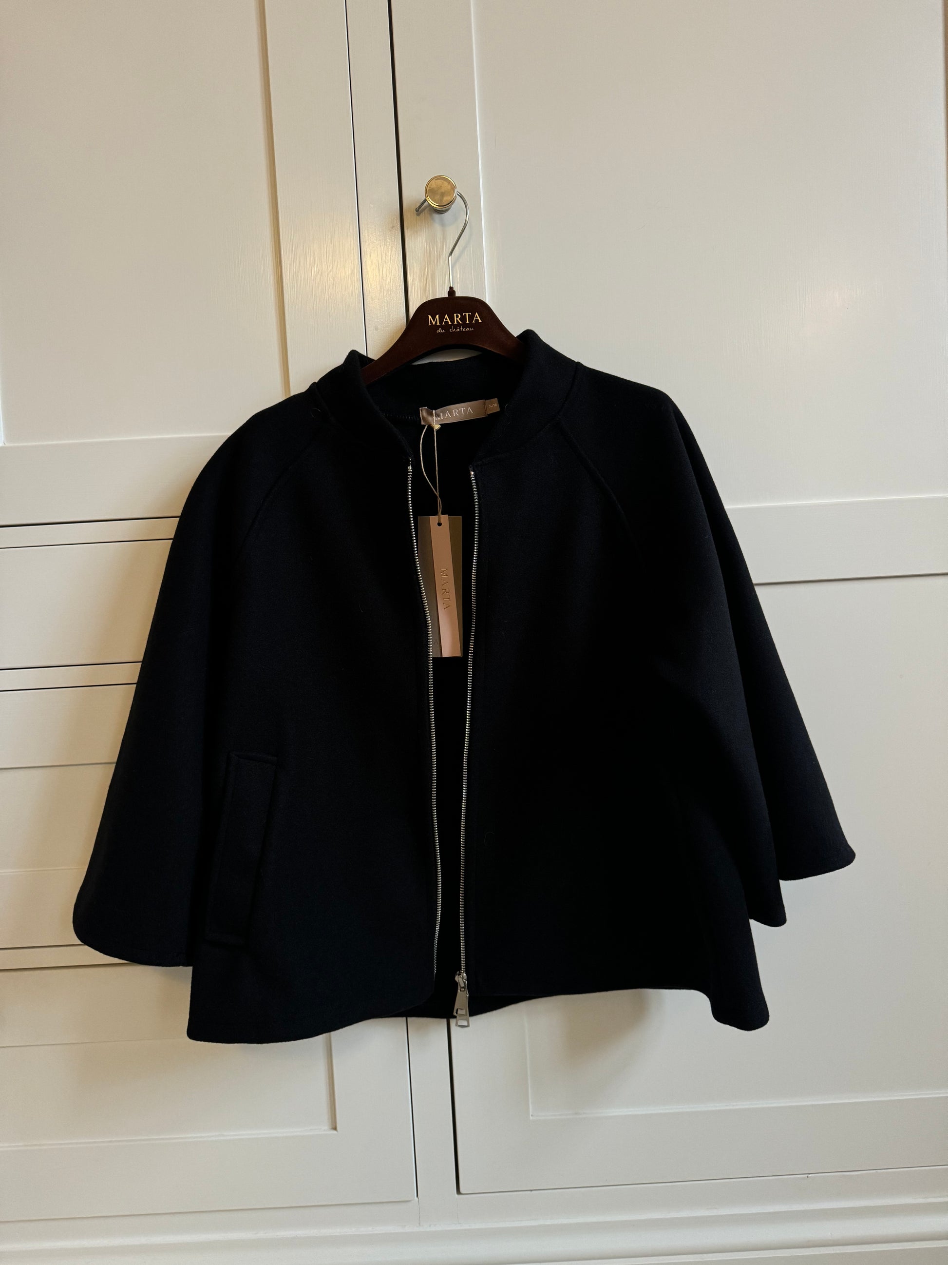 Flot kappe fra Marta du Château i sort. Kappen har fine flagermusærmer og lukkes med lynlås. Perfekt over dine langærmede t-shirts og strik. Kappen er en overgangsjakke, du kan bruge udendørs, hvis det ikke er for koldt.