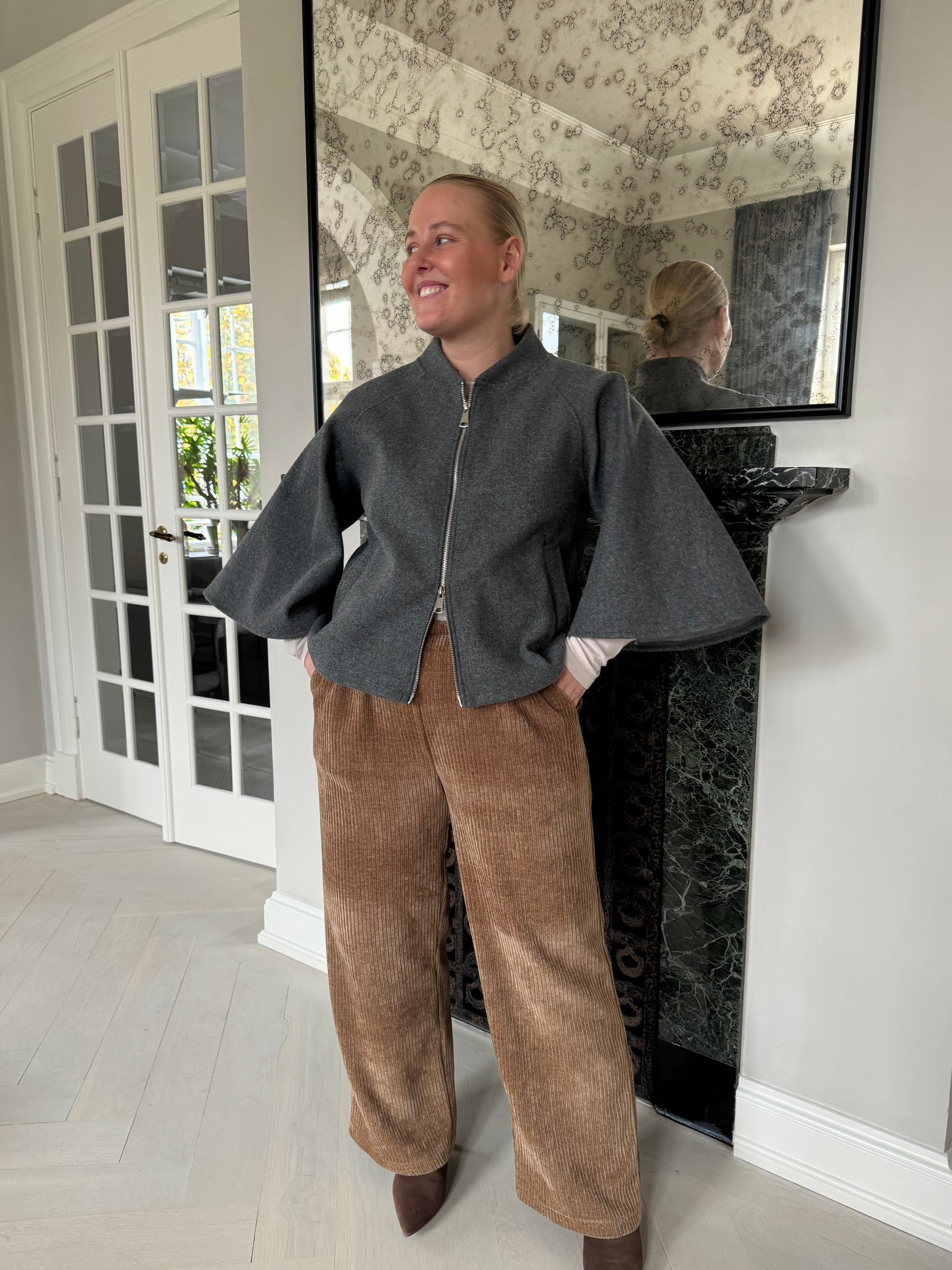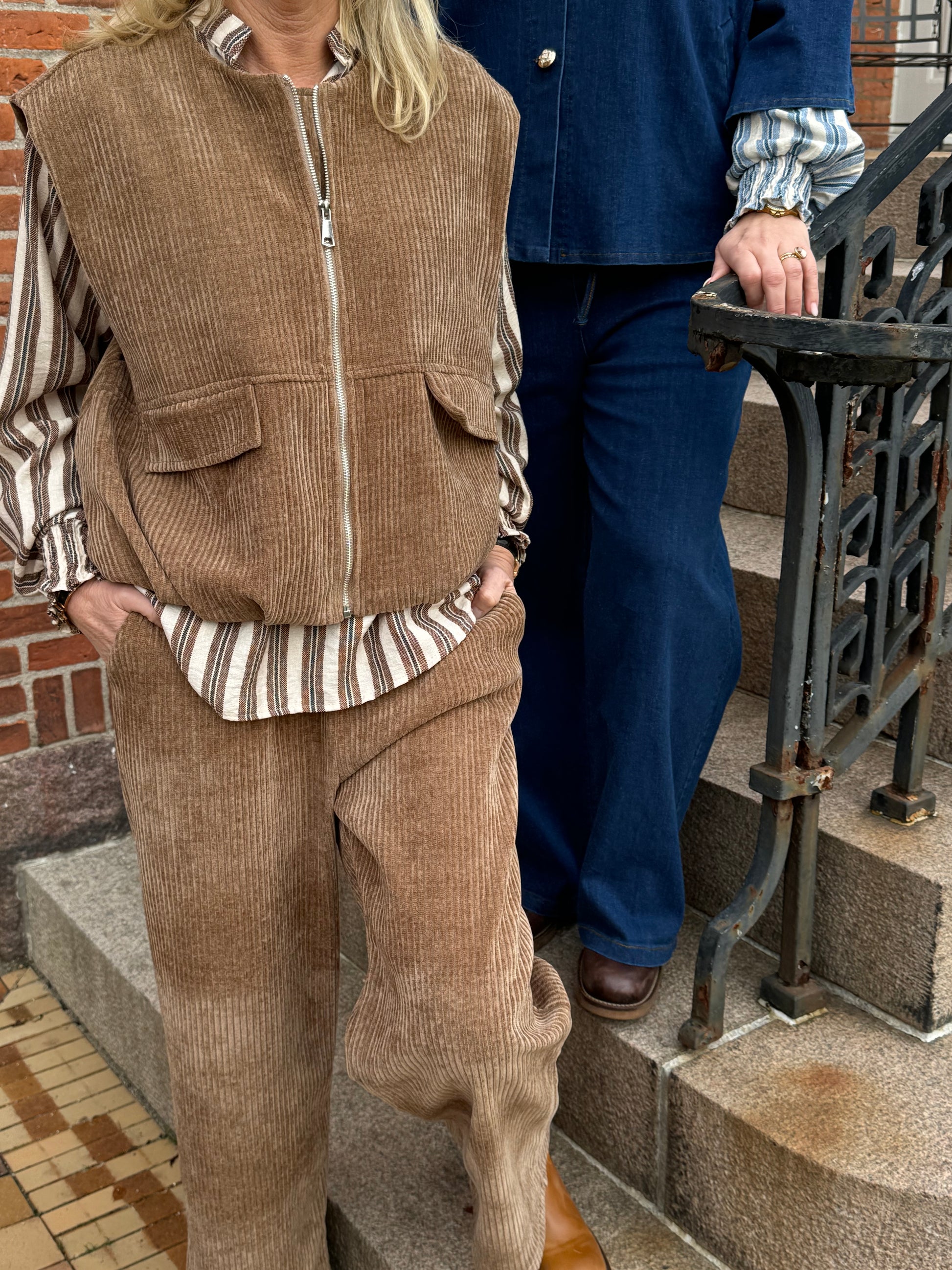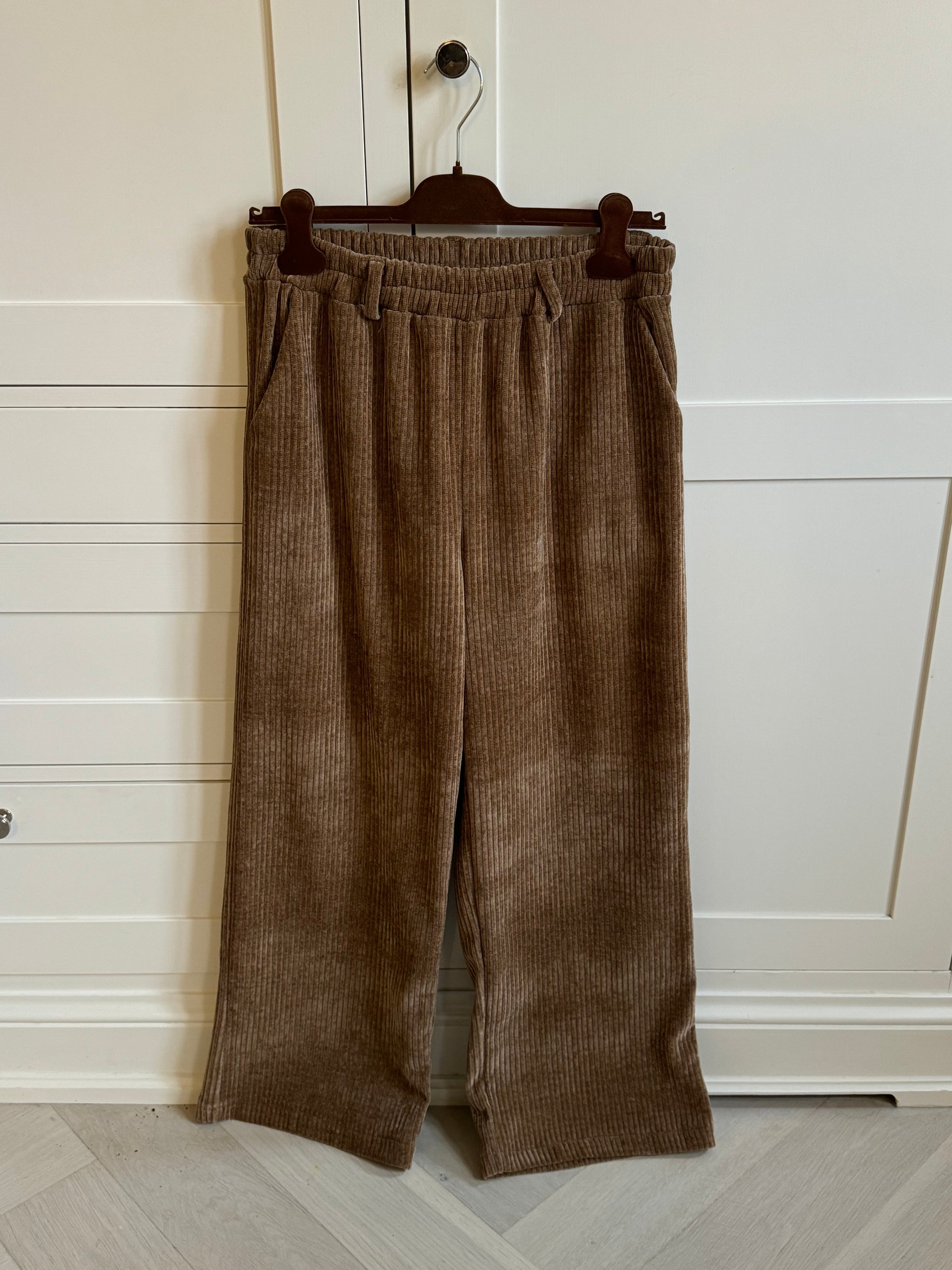 Brune fløjlsbukser fra Marta du Château. Buksen har elastik linningen og brede ben. Der er lommer i siderne, så du føler dig godt tilpas. Style med den stribede skjorte eller brune strik, som du ser på modelbillederne.