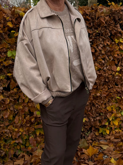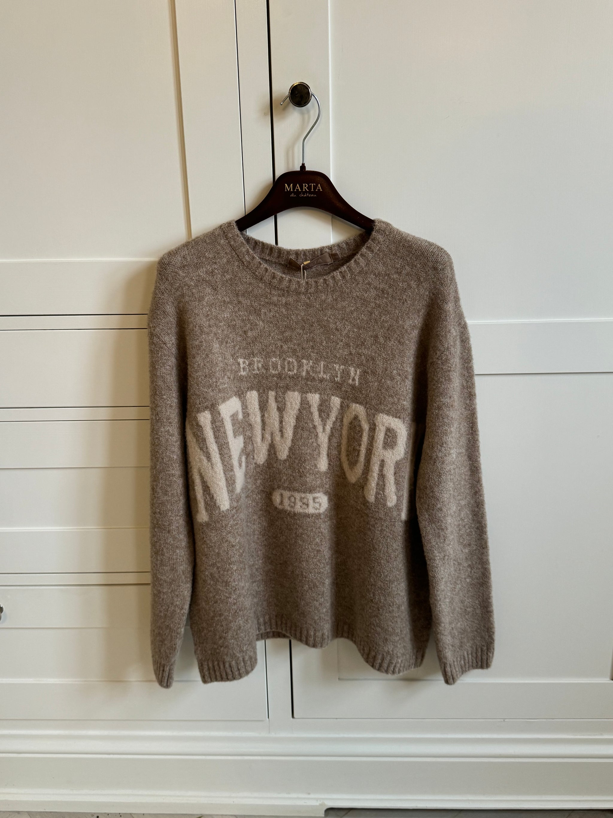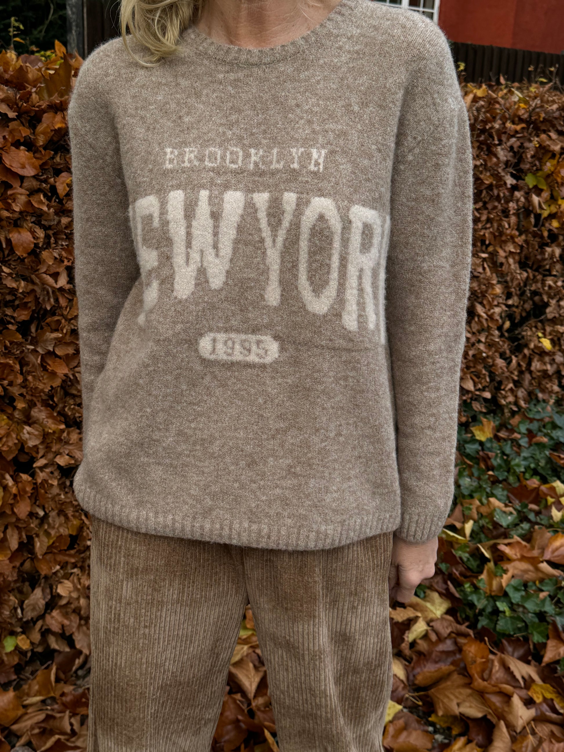 Brunmeleret strikbluse fra Marta du Château med teksten Brooklyn New York skrevet i off white tekst. Flot til lysebrune eller mørkebrune fløjlsbukser, som du ser på billedet.