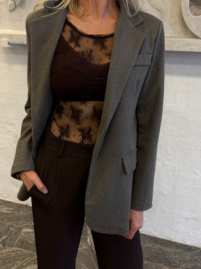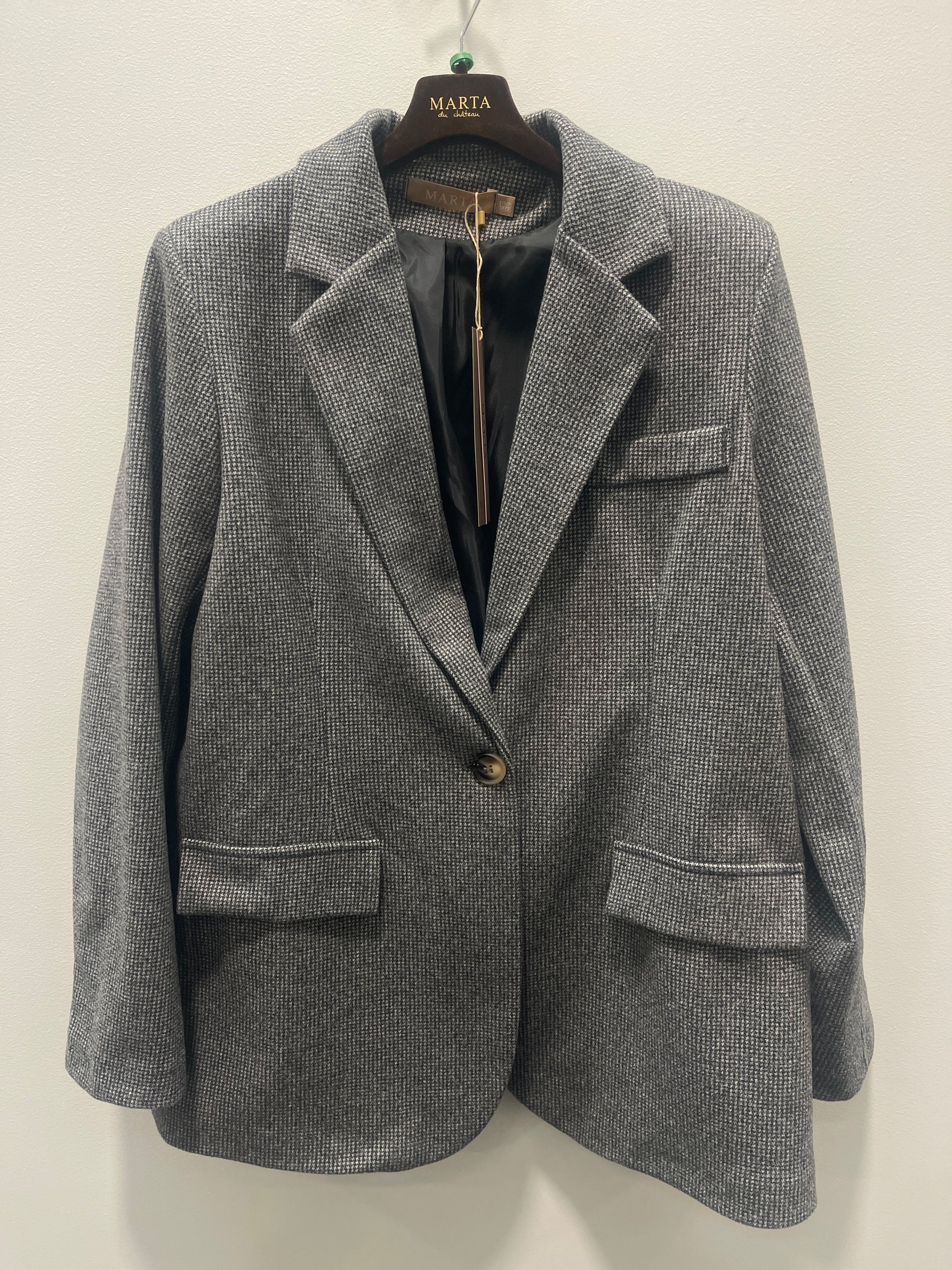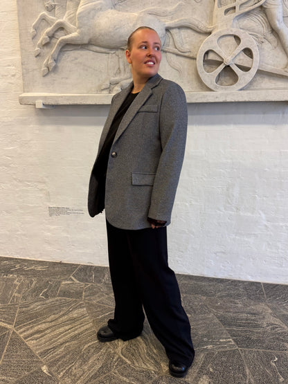 Fed blazer fra Marta du Château i grå toner. Blazeren er enkeltradet og lukkes med to knapper. Der er snydelommer med flap foran. Super cool til årets julefrokoster til et par sorte bukser med en fed blondebluse under.