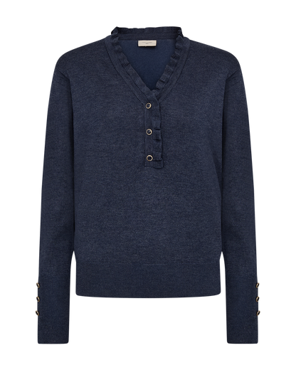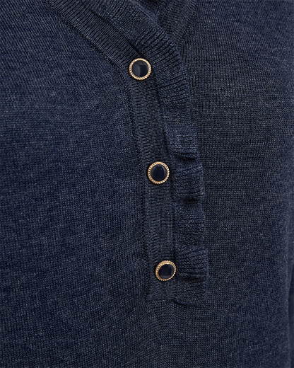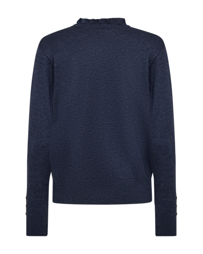 Den gode Katie strikbluse fra Freequent er kommet i en flot, mørkeblå farve. Blusen har knapper ned til brystet samt knapper ved manchetterne. Den fine revers giver blusen et lækkert polo look.