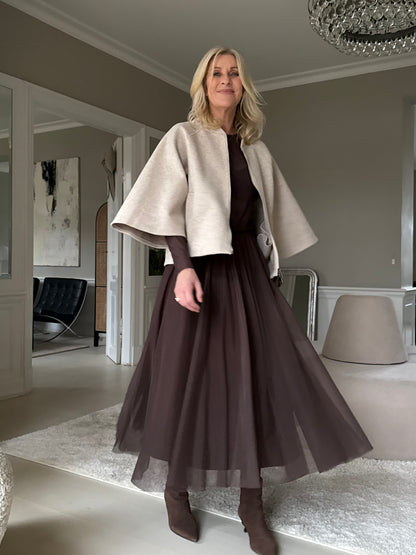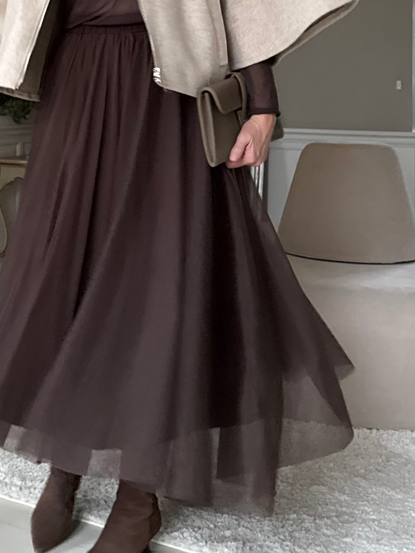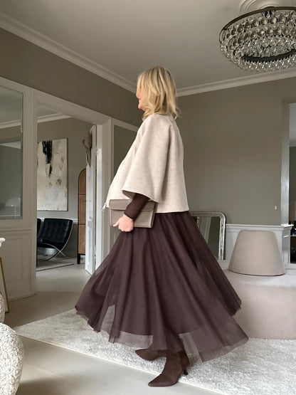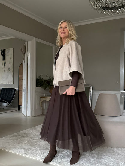 Smuk og let tyll nederdel fra Luxzuz i en fin, mørkebrun farve. Nederdelen har elastik i linningen og er foret i næsten hele længden. Det giver en virkelig flot effekt med det lette tyll lag udover. Style med en chunky strik og grove støvler, hvis du gerne vil lege lidt med kontrasterne i dit outfit. Du kan også style med en af de fine meshbluser, som du ser på modelbilledet, hvis det skal være lidt festligt.