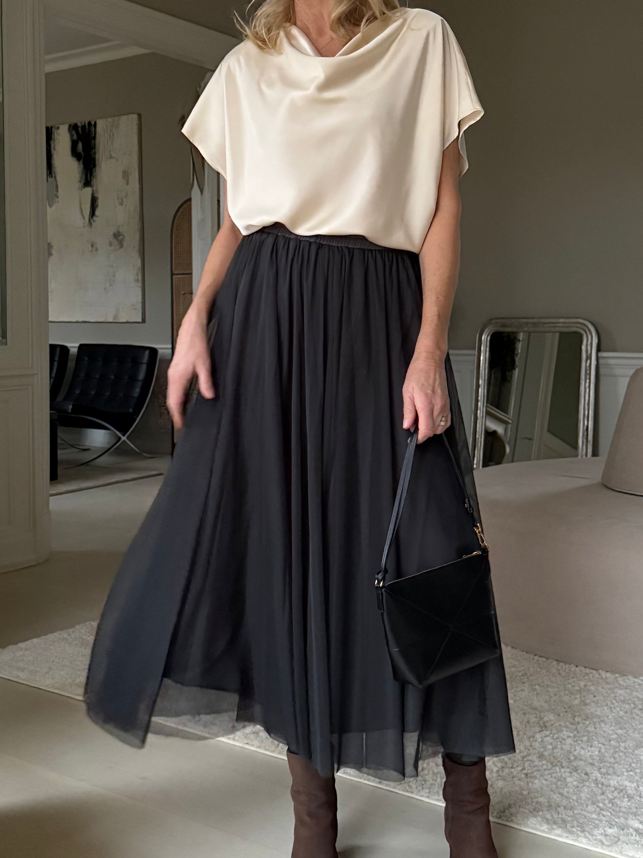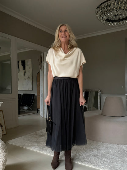 Fin tyll nederdel fra Luxzuz med elastik i linningen. Nederdelen er foret i næsten hele længden, så det ser rigtigt flot ud, når skørtet bevæger sig.