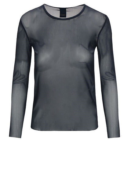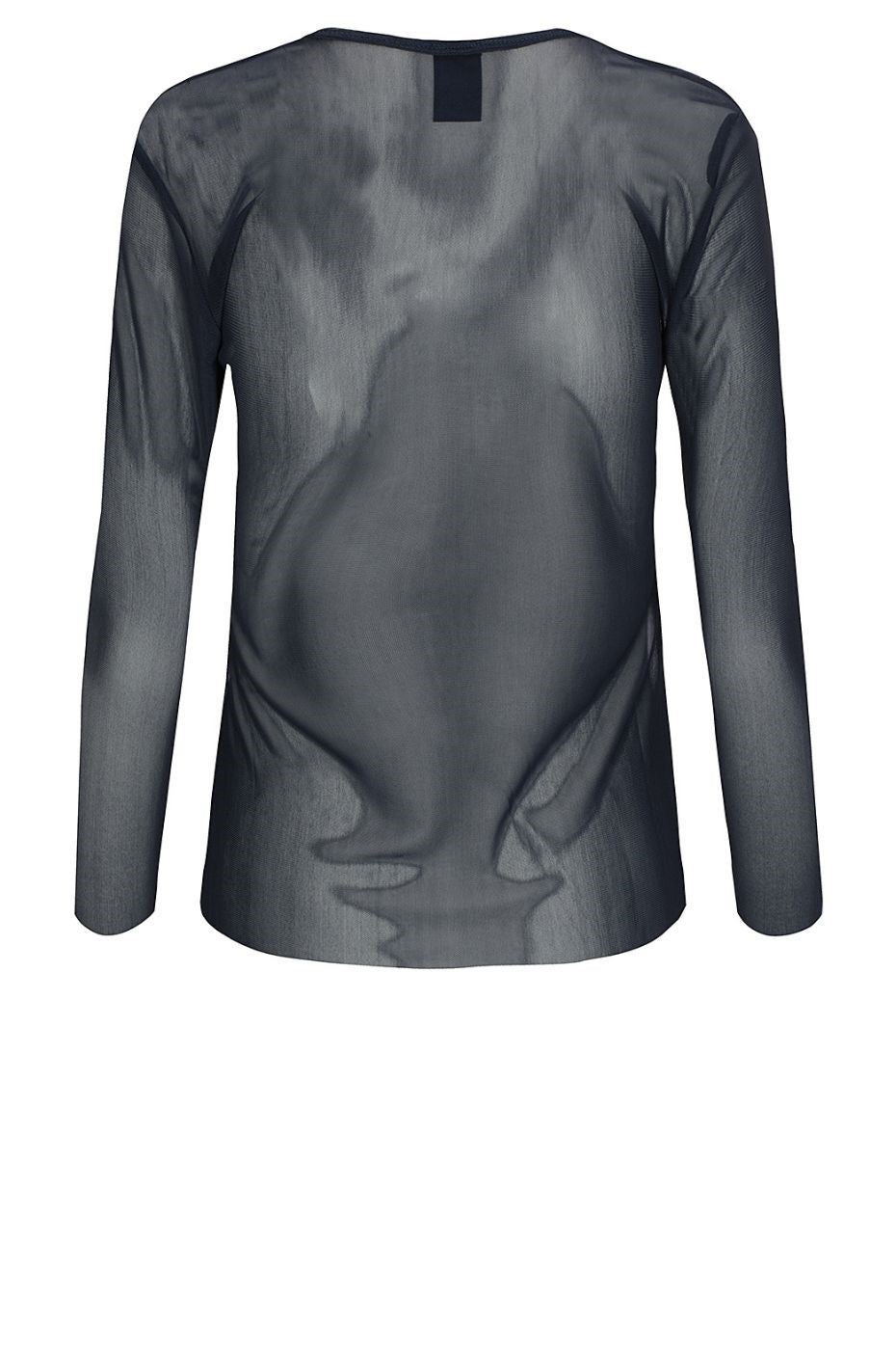 Mørkeblå mesh bluse fra Luxzuz. Blusen er transparent og kan derfor med fordel styles med en strik eller blazer over. Du kan selvfølgelig også bruge meshblusen til en julefrokost med en flot bh under.
