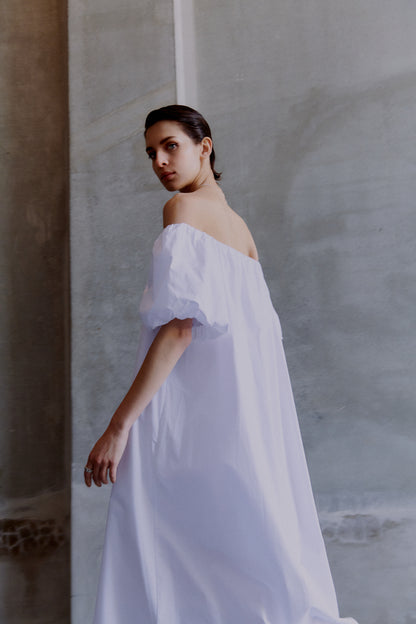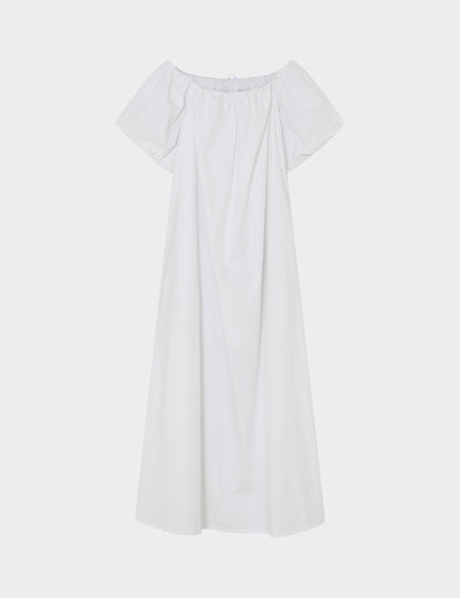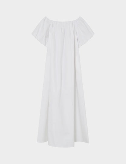 Off-shoulder kjole fra 2NDDAY, i off-white. Kjolen har har korte ballonærmer, som er med til at give et mere feminint udtryk.