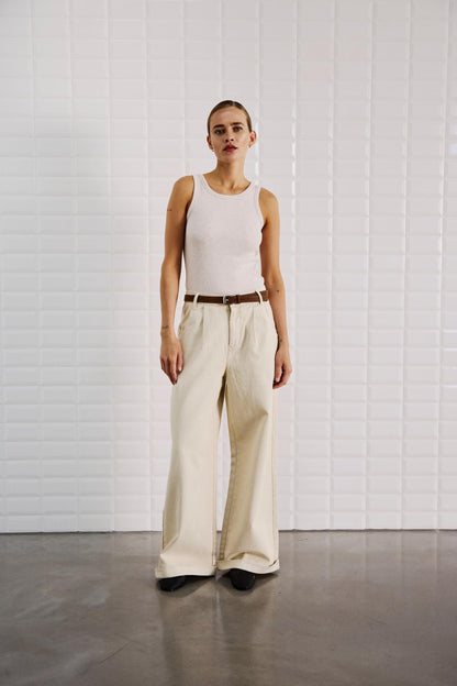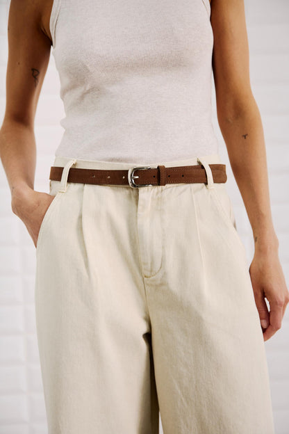 Off-white wide jeans med mellemhøj talje og tilhørende bælte fra WithBlack.Mål cm/str.:Talje: XS: 68 S: 72 M: 76 L: 80 XL: 84Hofte: XS: 95 S: 99 M: 103 L: 107 XL: 111Indvendig benmål: XS: 77 S: 77 M: 77 L: 77 XL: 77Benåbning: XS: 61 S: 62 M: 63 L: 64 XL: 65