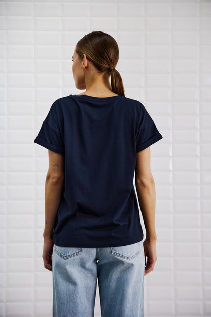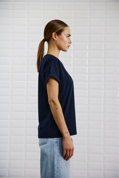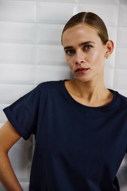 Mørkeblå T-shirt med detalje af opsmøg ved ærmer fra WithBlack, perfekt basis T-shirt til garderoben.