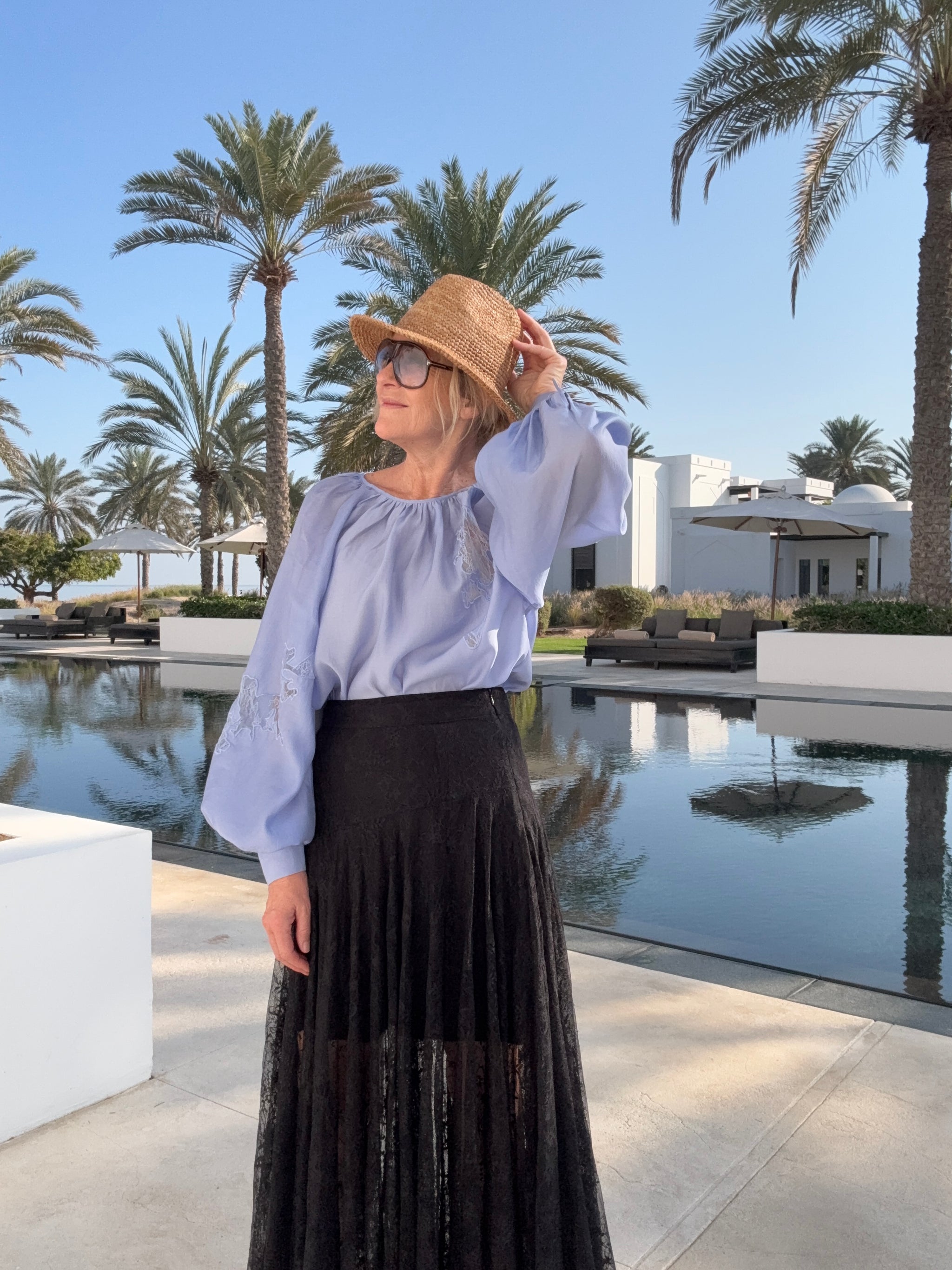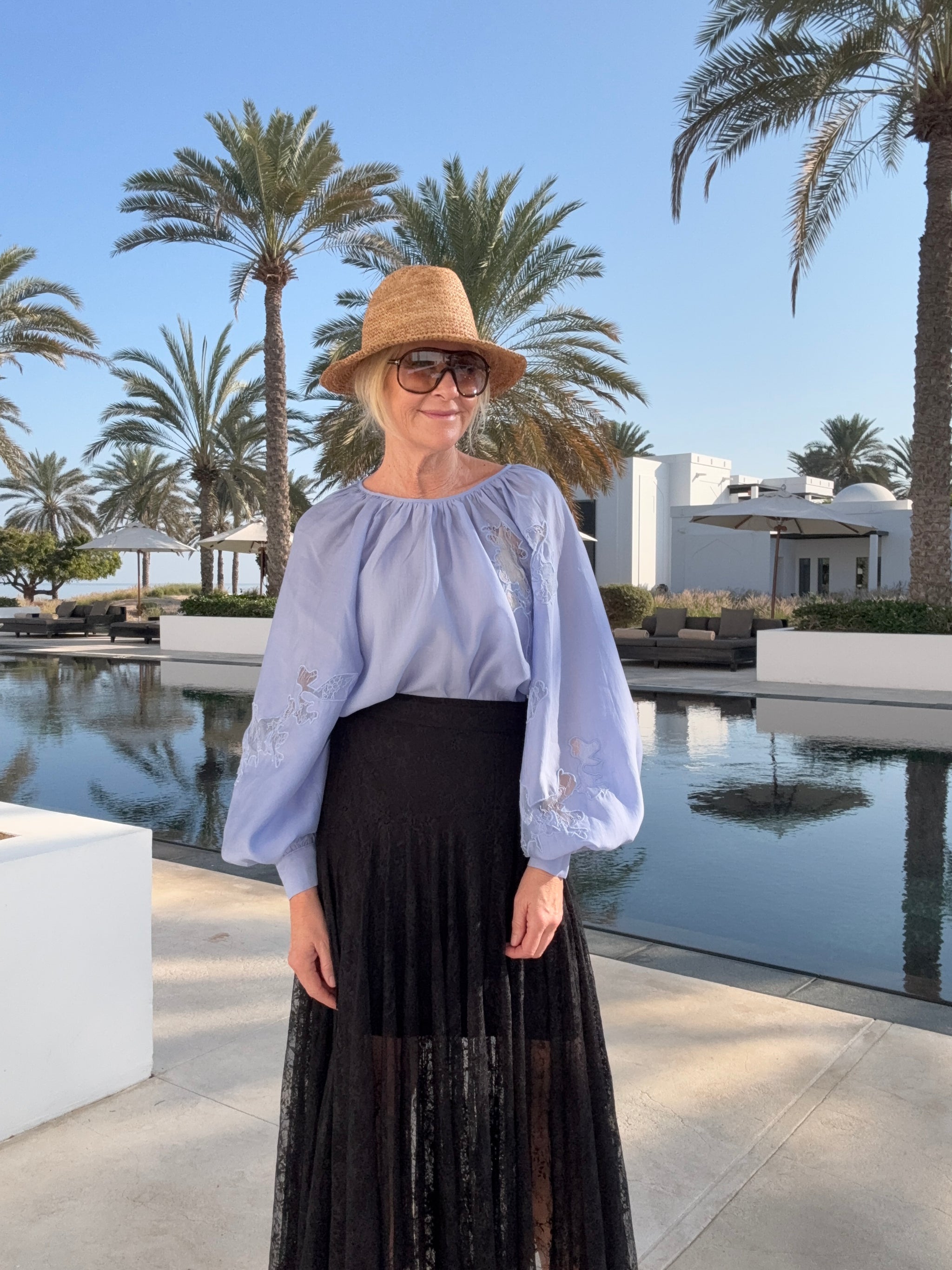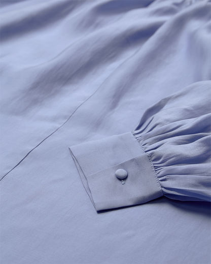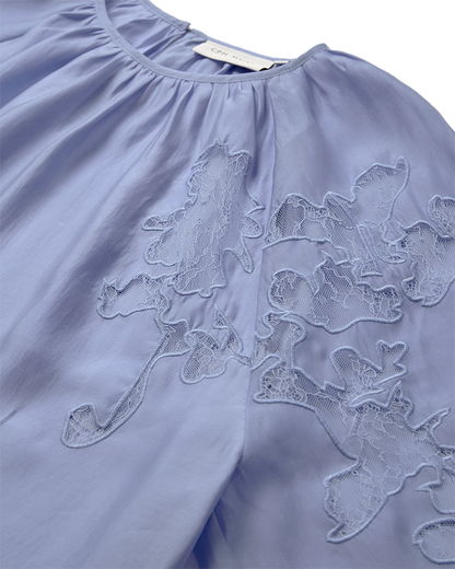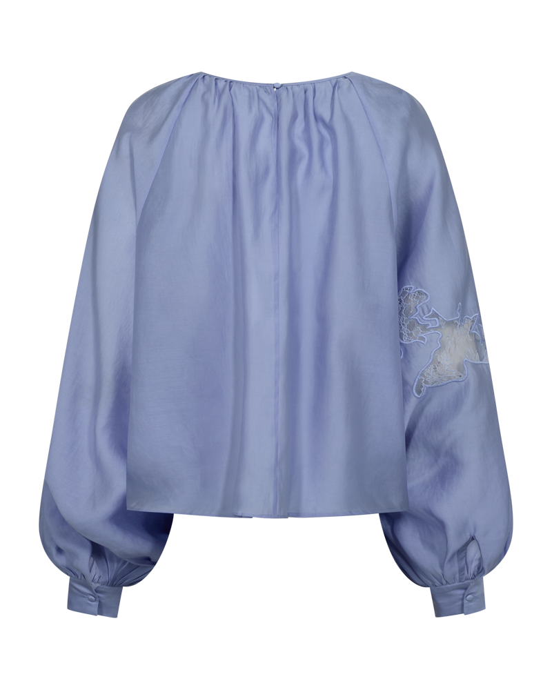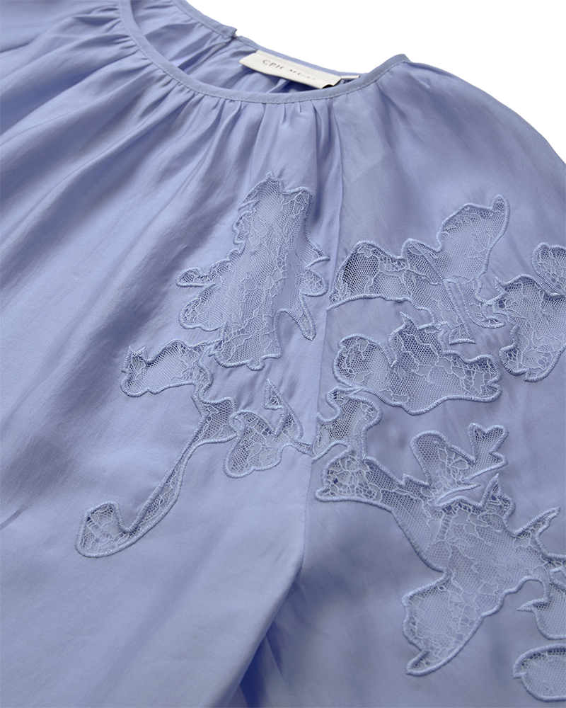 Smuk blå bluse fra Copenhagen Muse med fine ballonærmer, der giver et feminint og eksklusivt udtryk. Blusen er designet med elegante blonde-patches, som er smukt syet ind i blusen og tilfører et klassisk og sofistikeret look. En tidløs bluse, der nemt kan styles både til hverdag og mere formelle anledninger