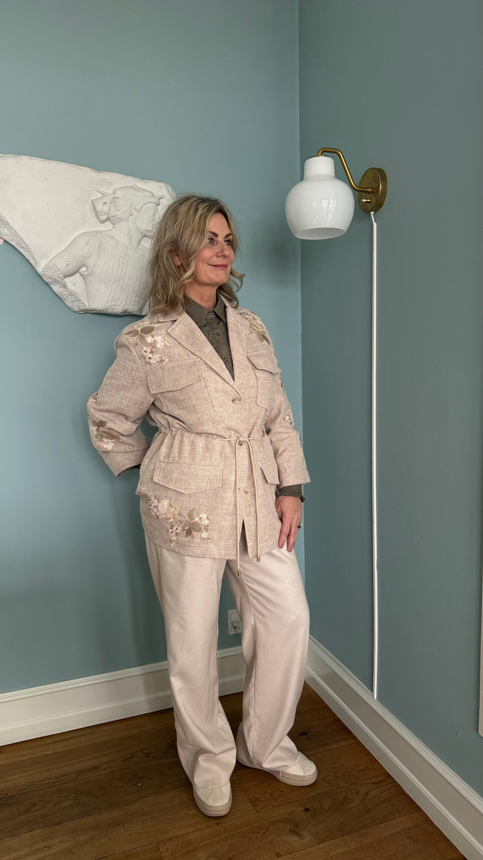 Feminin jakke fra Gustav med søde blomster broderier. Jakken lukkes med knapper og har et smalt bånd, der kan bindes i livet, hvis du ønsker et mere taljeret look.