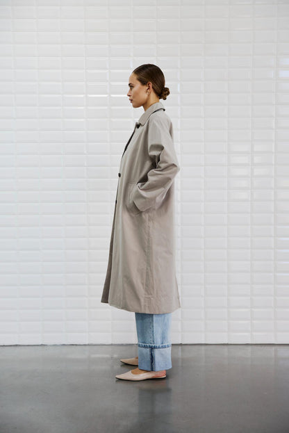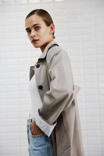 Lækker trenchcoat fra WithBlack i klassisk sandfarve. Jakken er lang og rummelig med lommer i siderne og fin krave. Den perfekte forårsjakke, du kan bruge, når vejret bliver lidt varmere. Mål:Bryst: XS: 114, S: 118, M: 122, L: 126Ærmelængde: XS: 75, S: 76, M: 77, L: 78Fuld længde: XS: 113, S: 114, M: 115, L: 116