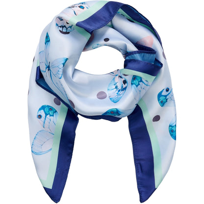 Smuk blå mønstret tørklæde fra Marta du Château. Kontrasten mellem den sarte blå farve og den mørkeblå kant på tørklædet giver en virkelig flot effekt. Sommerfugleprintet leder tankerne hen på forår og giver tørklædet et feminint og friskt pust. Style gerne til dine denim outfits, da lyseblå bare altid går godt til cowboybukser og denimskjorter.